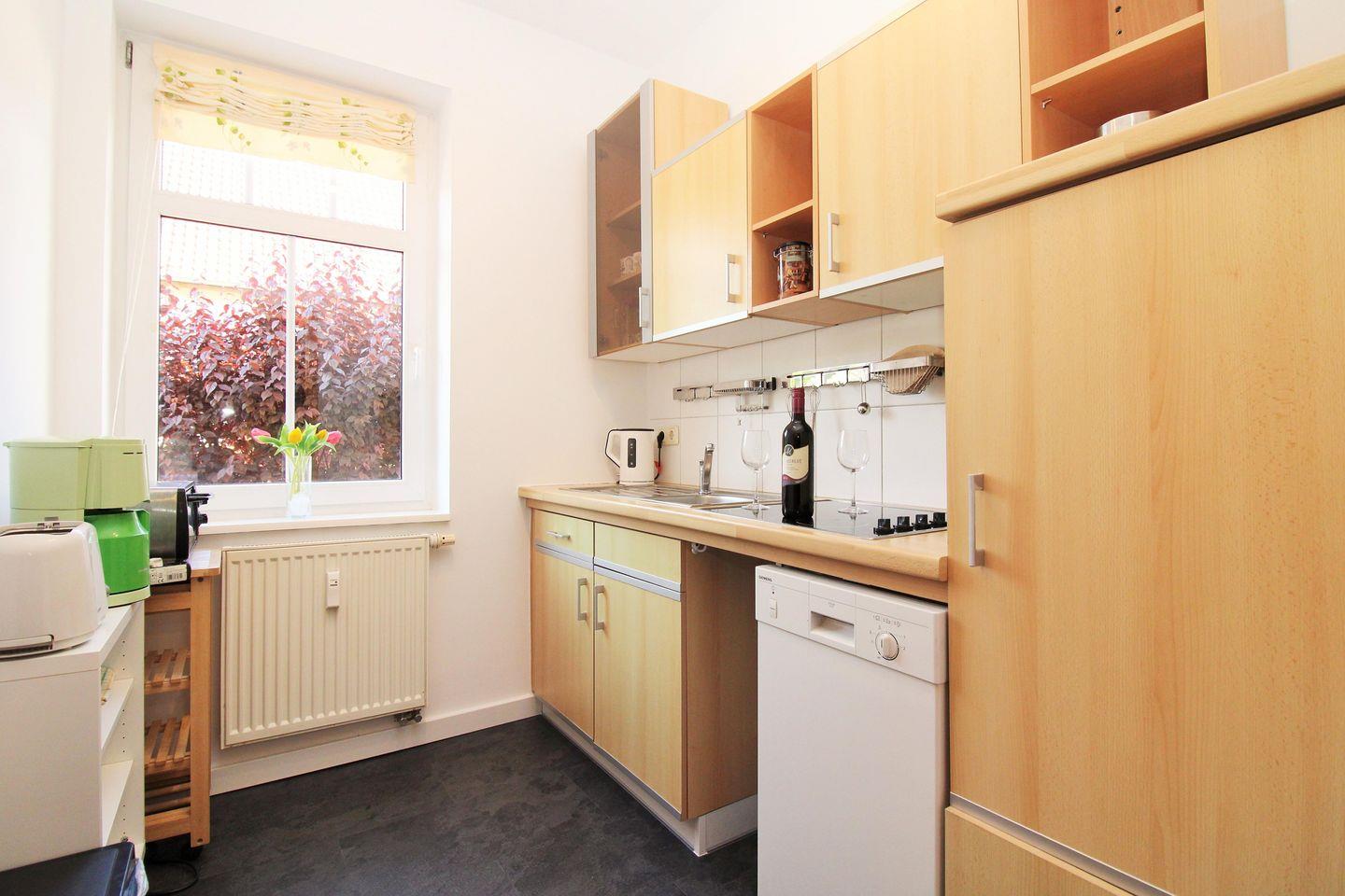 Die freundliche und gemütlich eingerichtete 2-Zimmer-Wohnung (ca. 53 m²) im Erdgeschoss (Hochparterre) besitzt ein hohes Maß an Funktionalität und ist komplett eingerichtet. Die Fußböden im Wohn- und Schlafzimmer, im Flur und im Bad sind gefliest, der Boden in der Küche ist hochwertiges Design-Laminat-
