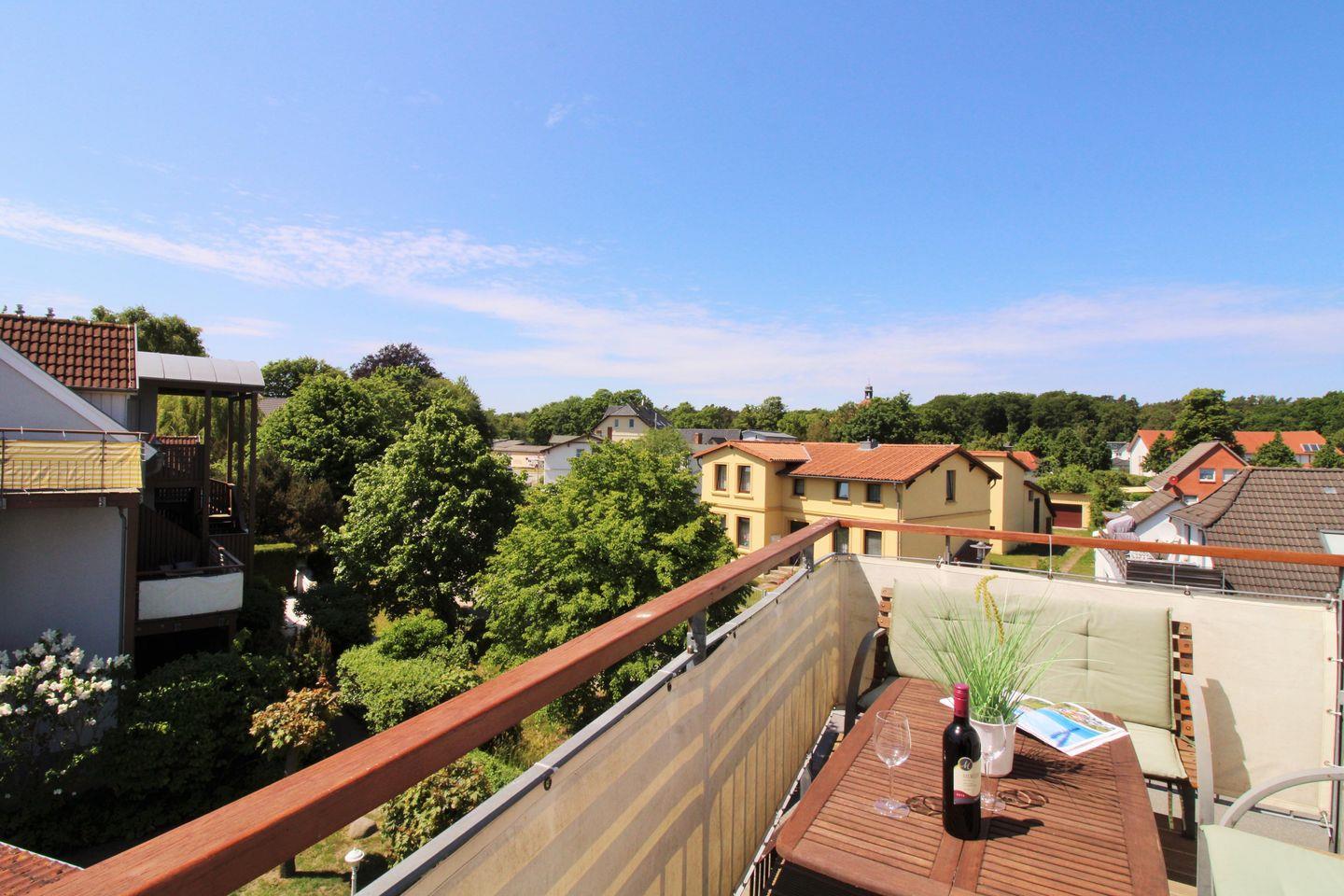 Das helle und freundliche Wohn-/Esszimmer verfügt über eine separate Sitzgruppe mit bequemer Couch und Couchtisch, einen separaten Esstisch mit 6 Stühlen sowie eine Kommode. Vom Wohnzimmer aus haben Sie direkten Zugang zu dem ca. 8 m² großen und sonnigen Balkon (nach Süden und Westen ausgerichtet) mit verschiedenen Balkonmöbeln - hier sitzen Sie entspannt und gemütlich im Grünen und können abends bei einem guten Glas Wein in Ruhe die lauen Sommernächte genießen!