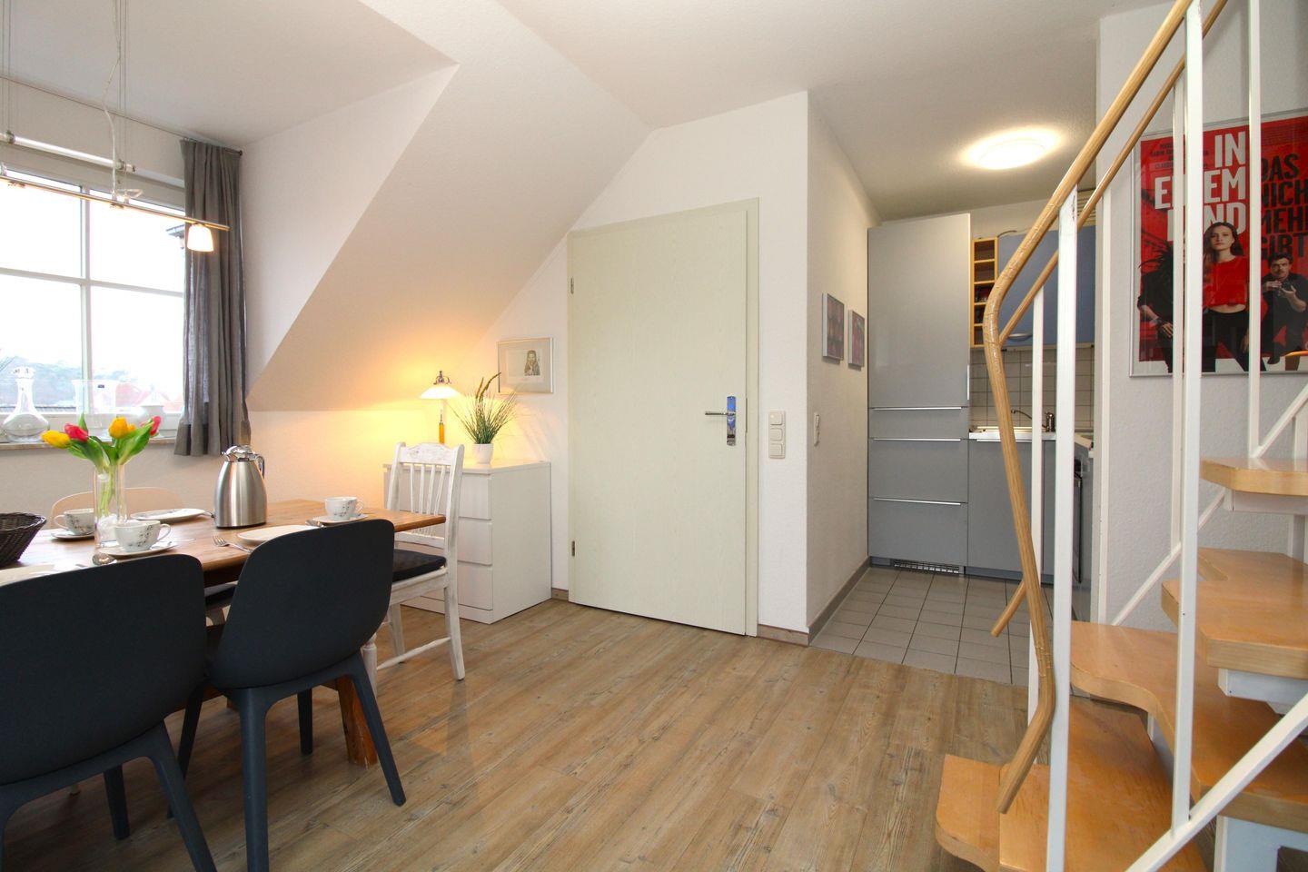 Über eine kleine Treppe aus dem Wohnzimmer erreichen Sie das Dachgeschoss der Wohnung mit dem 3. Schlafzimmer. Dieses ist ebenfalls mit 2 getrennt stehenden Einzelbetten, 2 Sesseln mit kleinem Tisch sowie 2 kleinen Kommoden eingerichtet und verfügt über ein zusätzliches kleines TV-Gerät. Wichtiger Hinweis: auf Grund der sehr steilen Treppe ist dieser Raum nicht (!) für kleine Kinder geeignet!