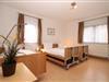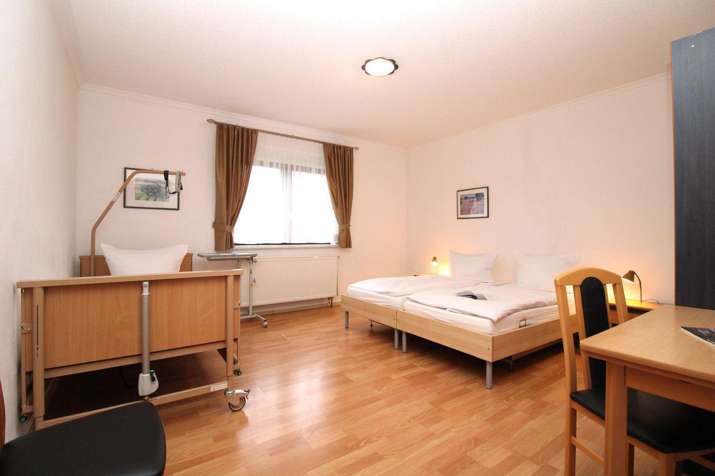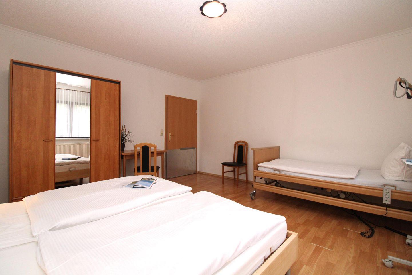 Das helle und geräumige 1. Schlafzimmer ist mit einem bequemen und elektrisch verstellbaren Pflege-Doppelbett, einem einzelnstehenden elektrisch verstellbaren Pflegebett, einem Einzelbett (90x200), Nachttischen, einem fahrbaren Beistelltisch, einem Stuhl sowie einem geräumigen Kleiderschrank eingerichtet.