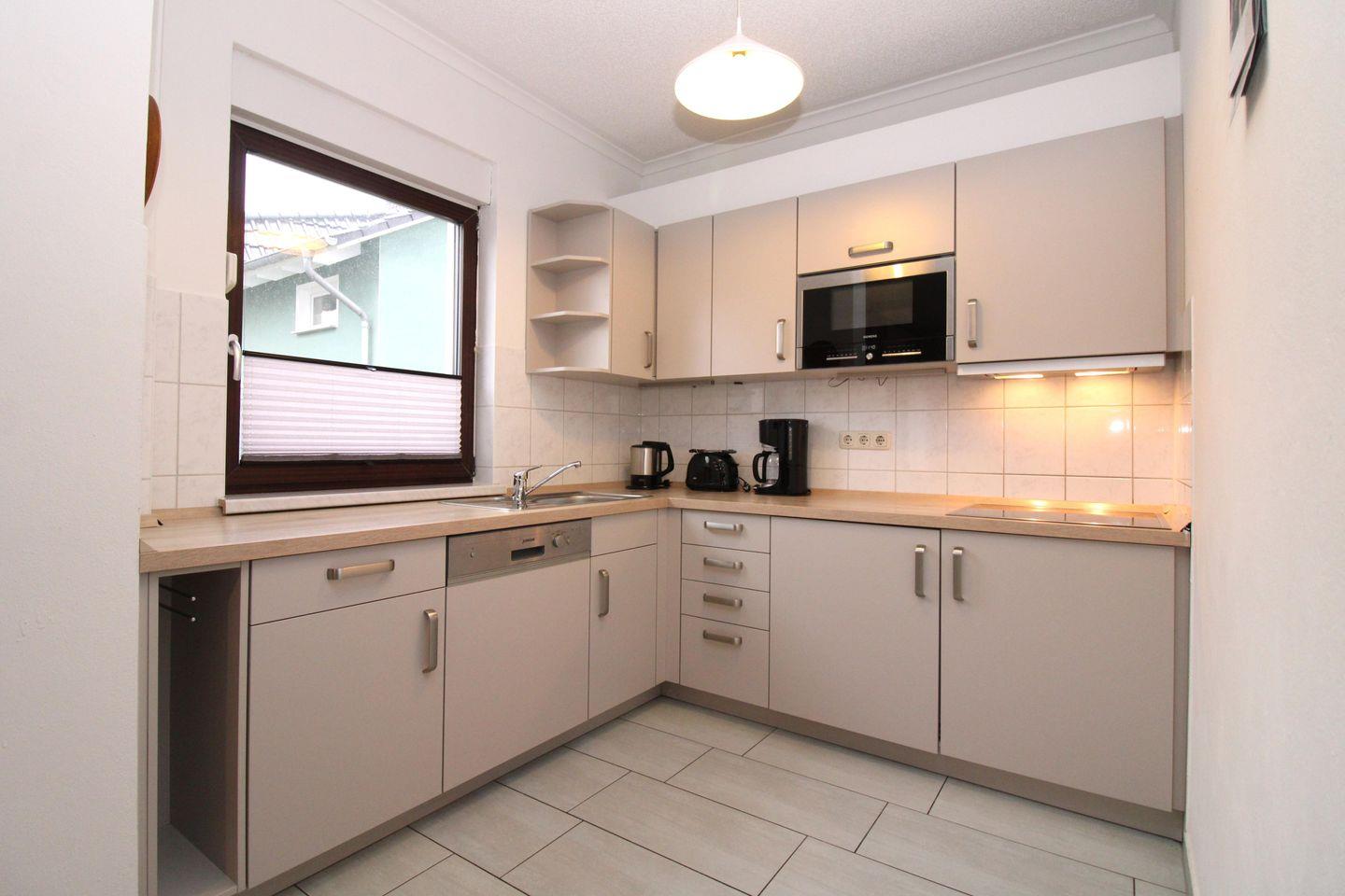Der helle und freundliche Haupt- bzw. Aufenthaltsraum im Eingangsbereich (mit großer Garderobe) dieser großzügigen Wohnung gliedert sich in den Wohn-, Ess- und Küchenbereich. Der Wohnbereich verfügt über eine separate Sitzgruppe mit zwei bequemen Couchen, Sessel und Couchtisch sowie ein Sideboard. Hier schließt sich der Essbereich mit 2 großen getrennten Esstischen mit jeweils 6 Stühlen sowie einem weiteren Sideboard an. Der separate offene Küchenbereich beinhaltet eine voll ausgestattete Einbauküchenzeile mit 4-Zonen-Ceran-Kochfeld, Mikrowelle, Kühlschrank mit Gefrierfach, Geschirrspülmaschine, Kaffeemaschine, Wasserkocher sowie Toaster. Die Küche ist mit Geschirr, Gläsern, Besteck und Töpfen vollständig ausgestattet.