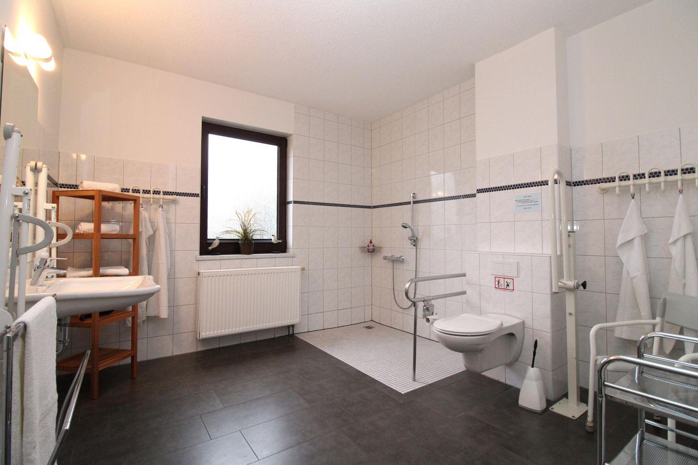 Das rollstuhlgerechte und sehr geräumige Badezimmer (mit Tageslicht / Fenster) verfügt über eine bodenebene befahrbare Dusche, einen Pflege-Duschstuhl, WC, Waschbecken, Kosmetikspiegel, Föhn sowie ausreichend Ablagemöglichkeiten. Im Eingangsbereich des Badezimmers befindet sich räumlich abgetrennt noch eine separate weitere Dusche mit Waschbecken, Spiegelschrank und WC.