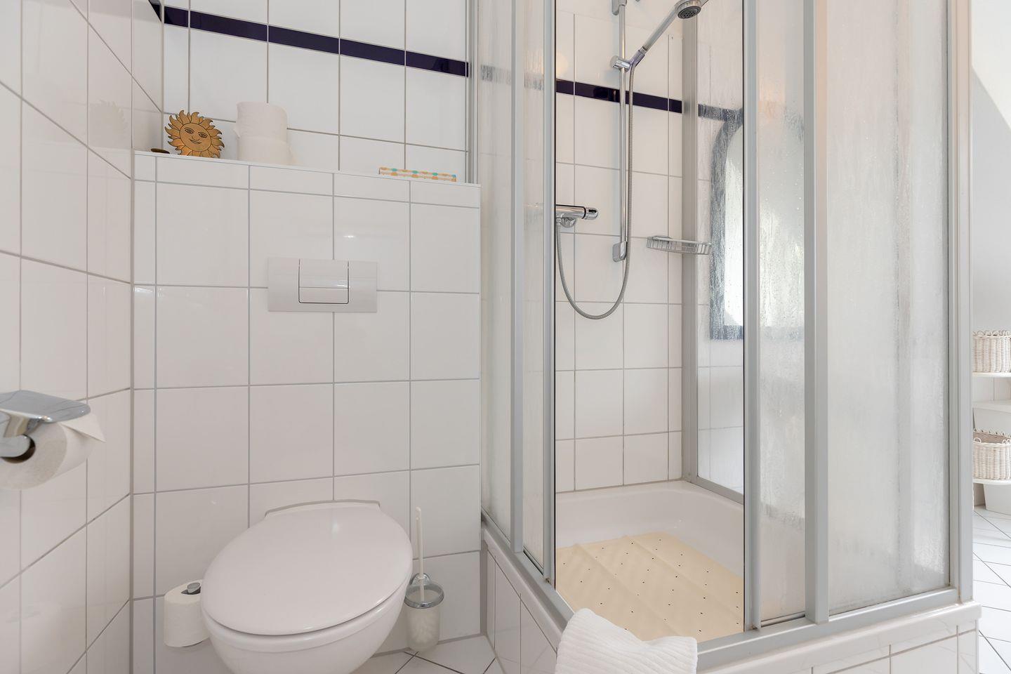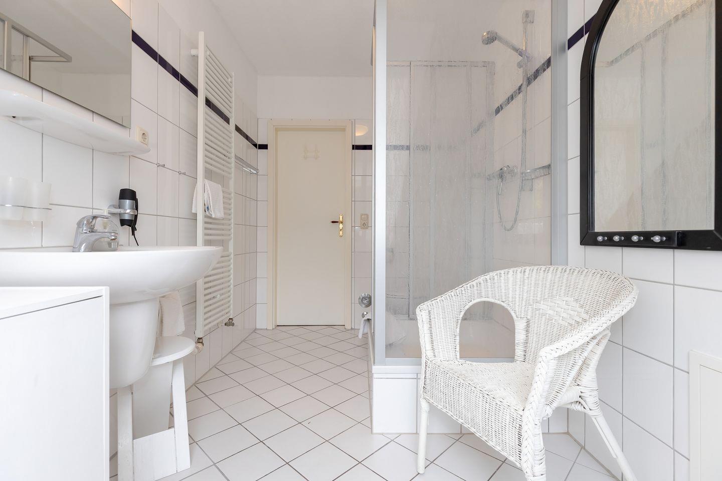 Das geräumige Badezimmer (mit Tageslicht / Fenster) verfügt über eine Dusche, Waschbecken, WC, Föhn, Handtuch-Heizkörper sowie ausreichend Ablagemöglichkeiten.