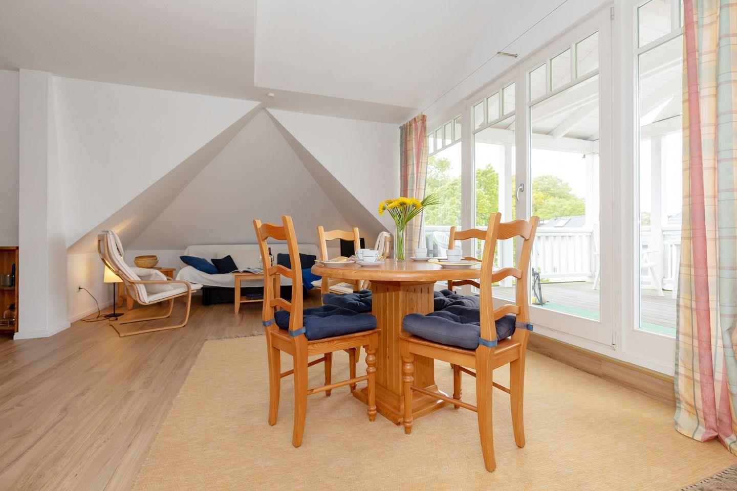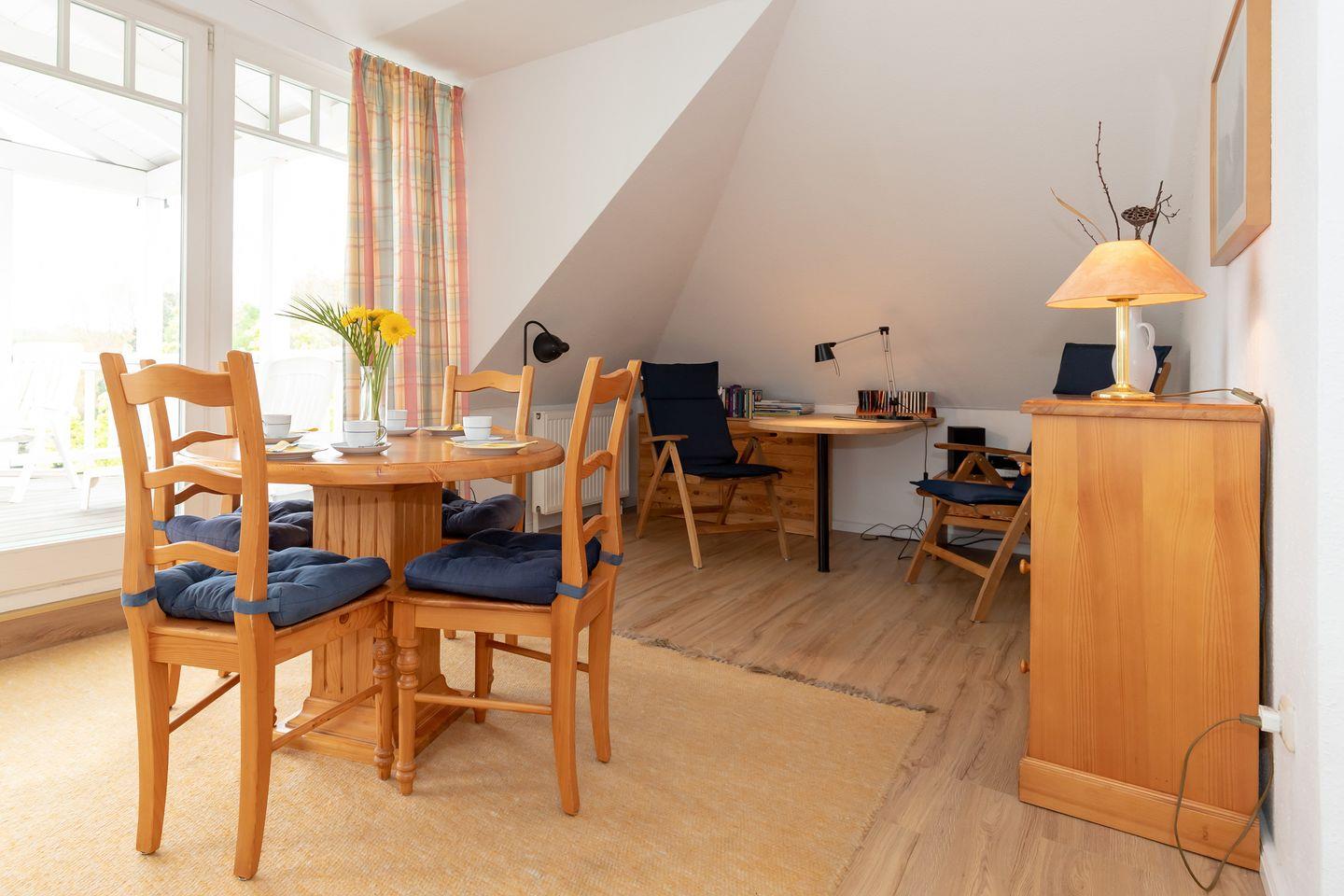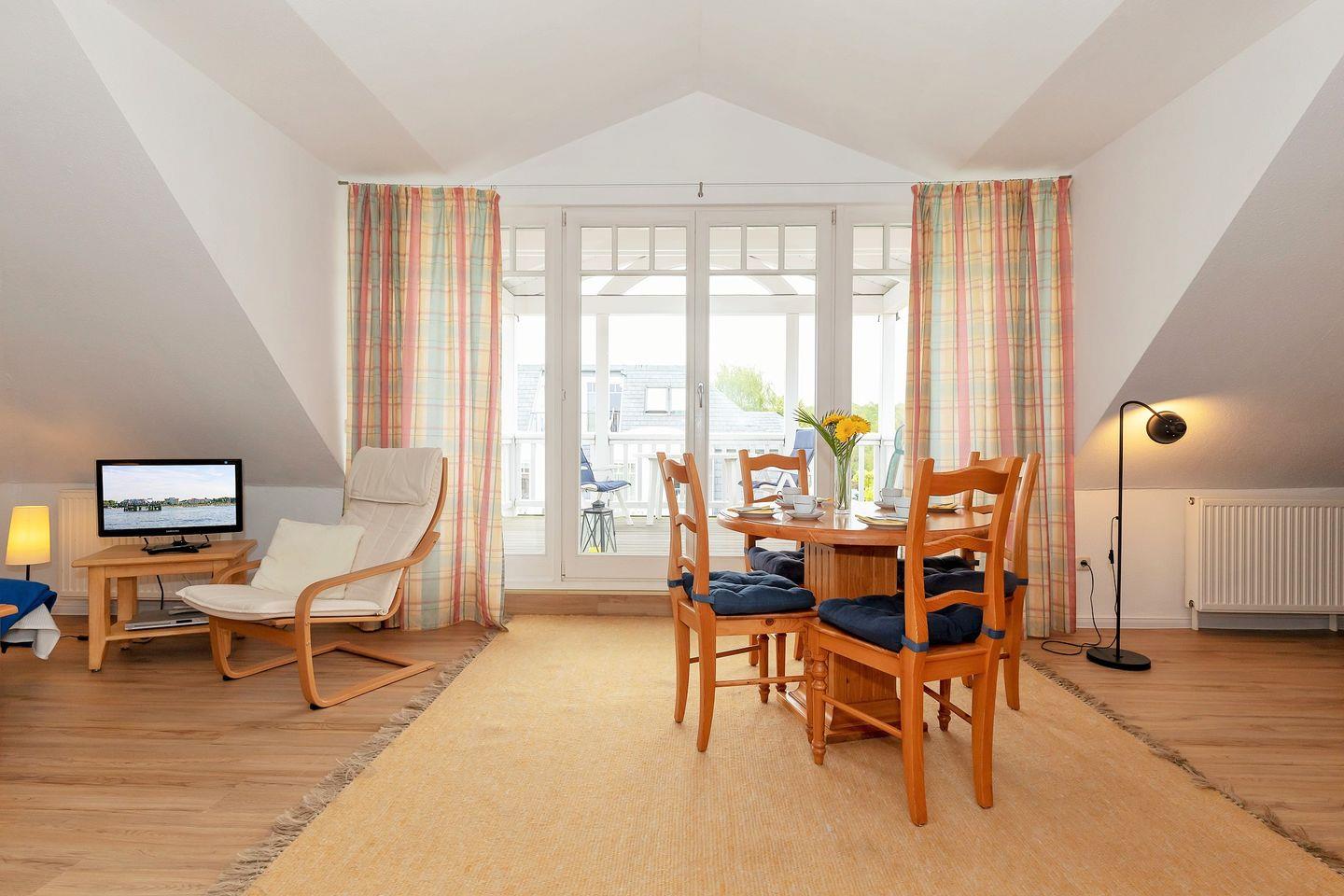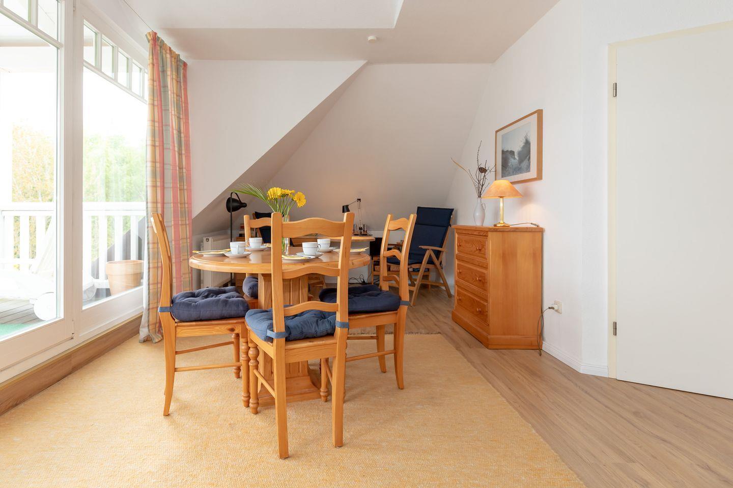 Das geräumige und gemütliche Wohn-/Esszimmer verfügt über eine Sitzgruppe mit bequemer Couch, 2 Sesseln und Couchtisch, eine zusätzliche kleine Leseecke mit Tisch und 2 Stühlen, einen separaten Esstisch mit 4 Stühlen sowie eine Kommode. Vom Wohnzimmer aus haben Sie direkten Zugang zu dem großen (ca. 12 m²) überdachten Balkon (nach Süd-Osten ausgerichtet) mit Balkonmöbeln und Sonnenliegen - hier sitzen Sie entspannt und gemütlich mitten im Grünen und können bei einem guten Glas Wein die lauen Sommernächte über den Dächern von Kühlungsborn genießen …!
