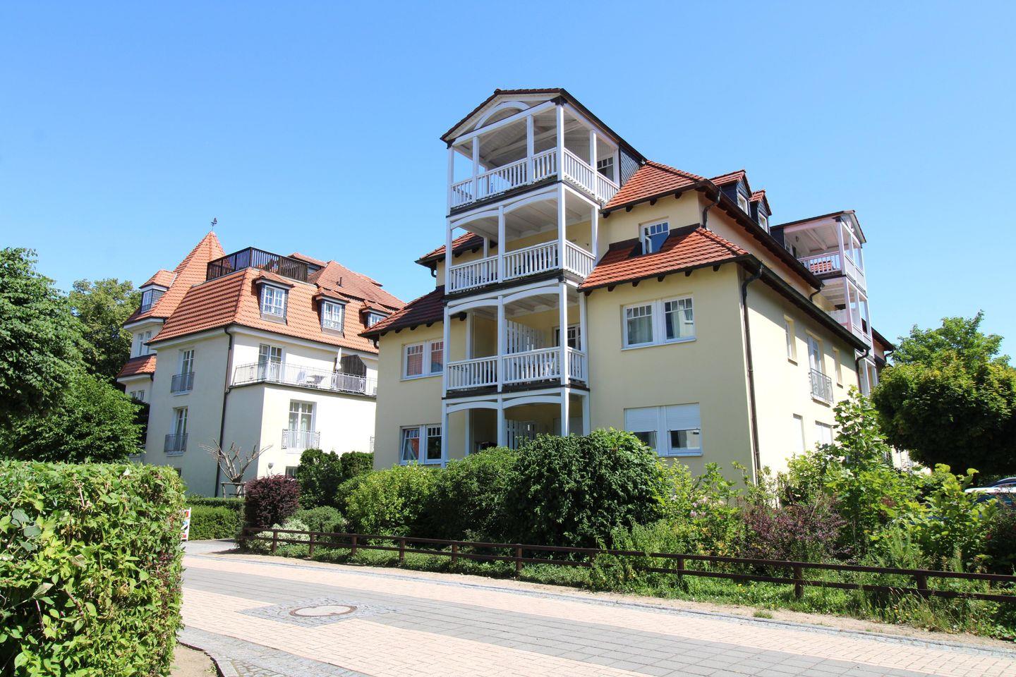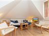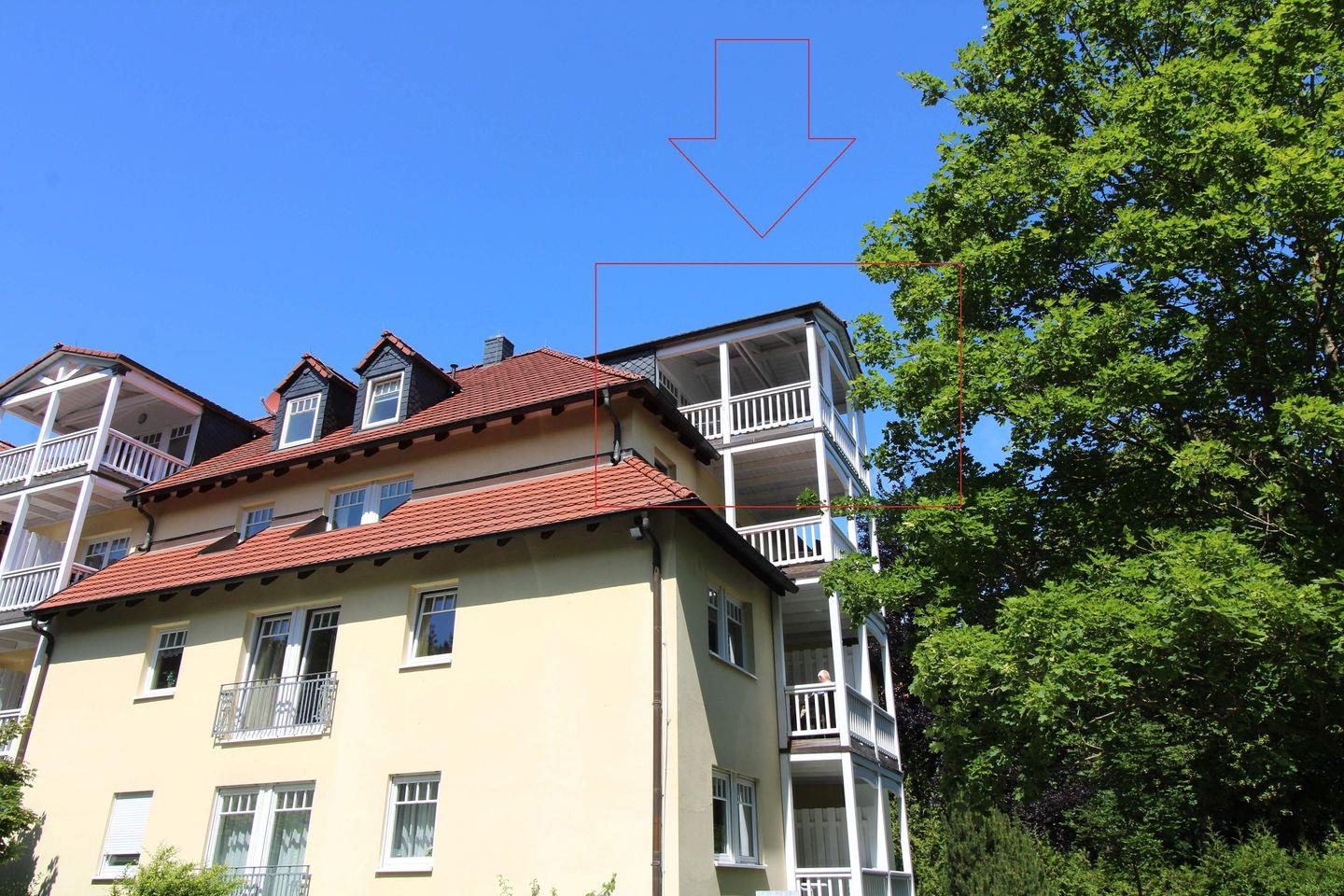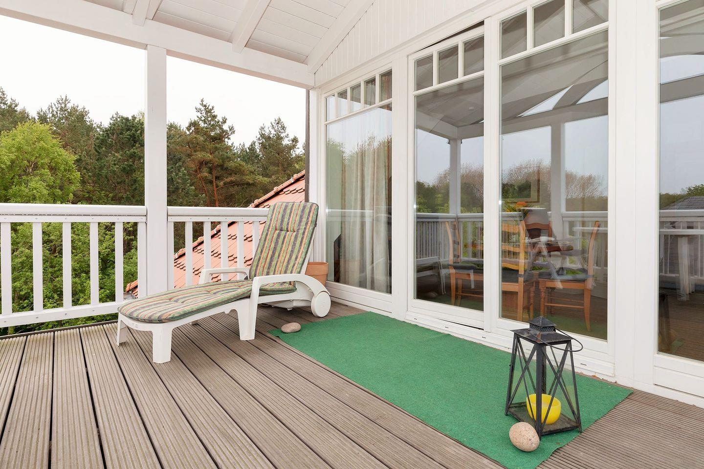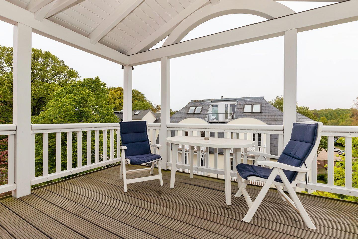 Das geräumige und gemütliche Wohn-/Esszimmer verfügt über eine Sitzgruppe mit bequemer Couch, 2 Sesseln und Couchtisch, eine zusätzliche kleine Leseecke mit Tisch und 2 Stühlen, einen separaten Esstisch mit 4 Stühlen sowie eine Kommode. Vom Wohnzimmer aus haben Sie direkten Zugang zu dem großen (ca. 12 m²) überdachten Balkon (nach Süd-Osten ausgerichtet) mit Balkonmöbeln und Sonnenliegen - hier sitzen Sie entspannt und gemütlich mitten im Grünen und können bei einem guten Glas Wein die lauen Sommernächte über den Dächern von Kühlungsborn genießen …!