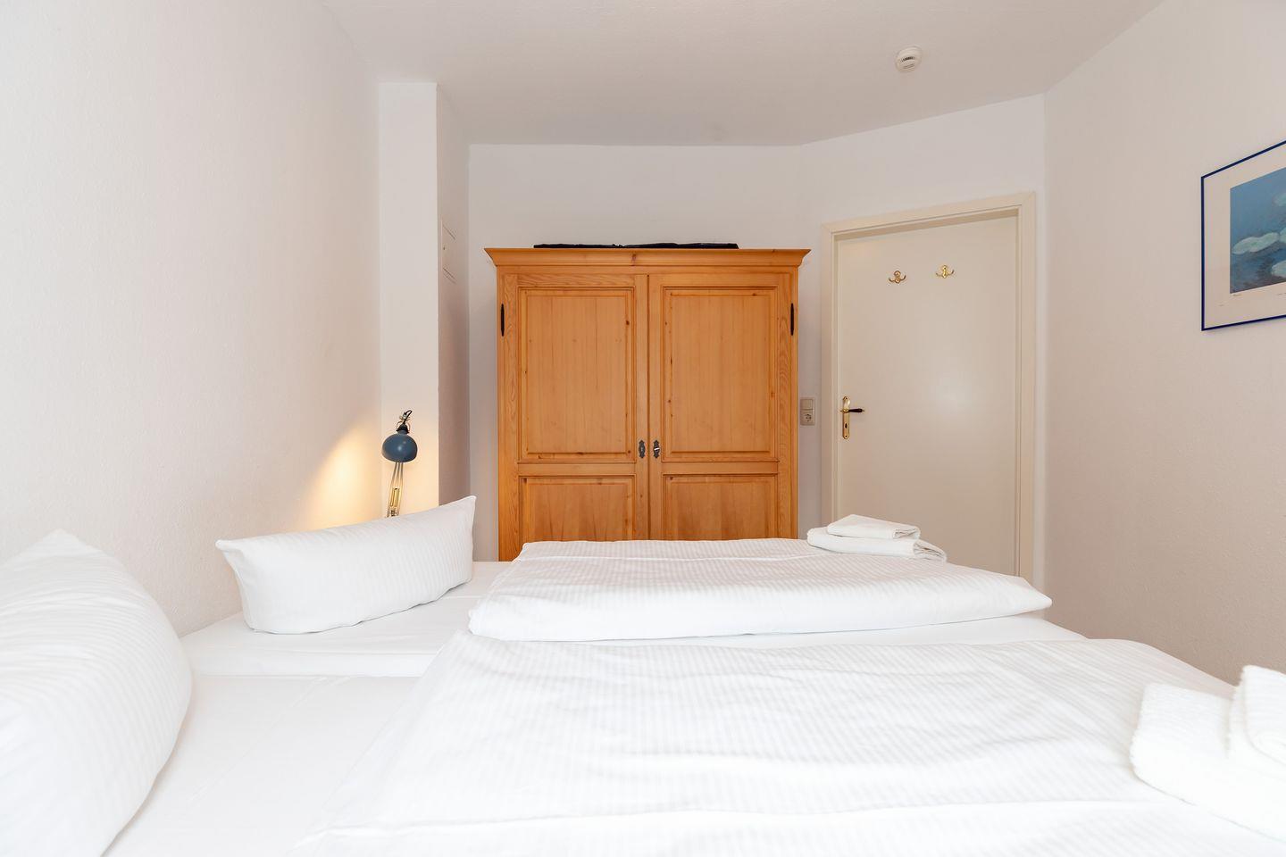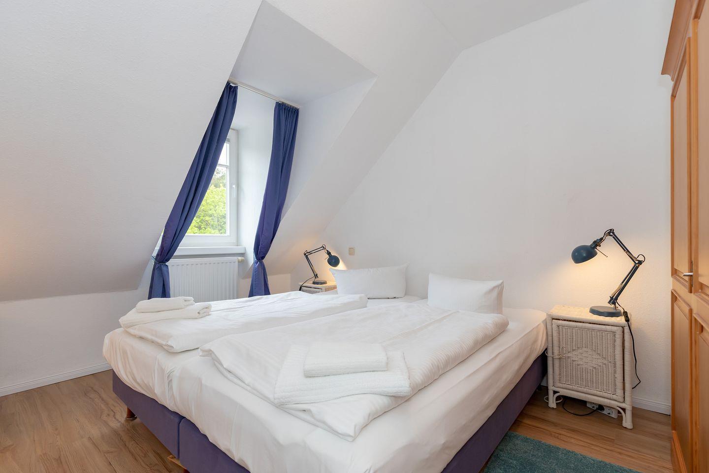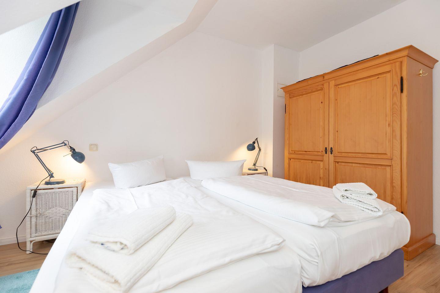 Das helle Schlafzimmer ist mit einem bequemen Doppelbett, Nachttischen sowie einem geräumigen Kleiderschrank eingerichtet. Eine zusätzliche bequeme Schlafmöglichkeit für eine weitere 3. bzw. 4. Person bietet die ausziehbare Schlafcouch im Wohnzimmer.