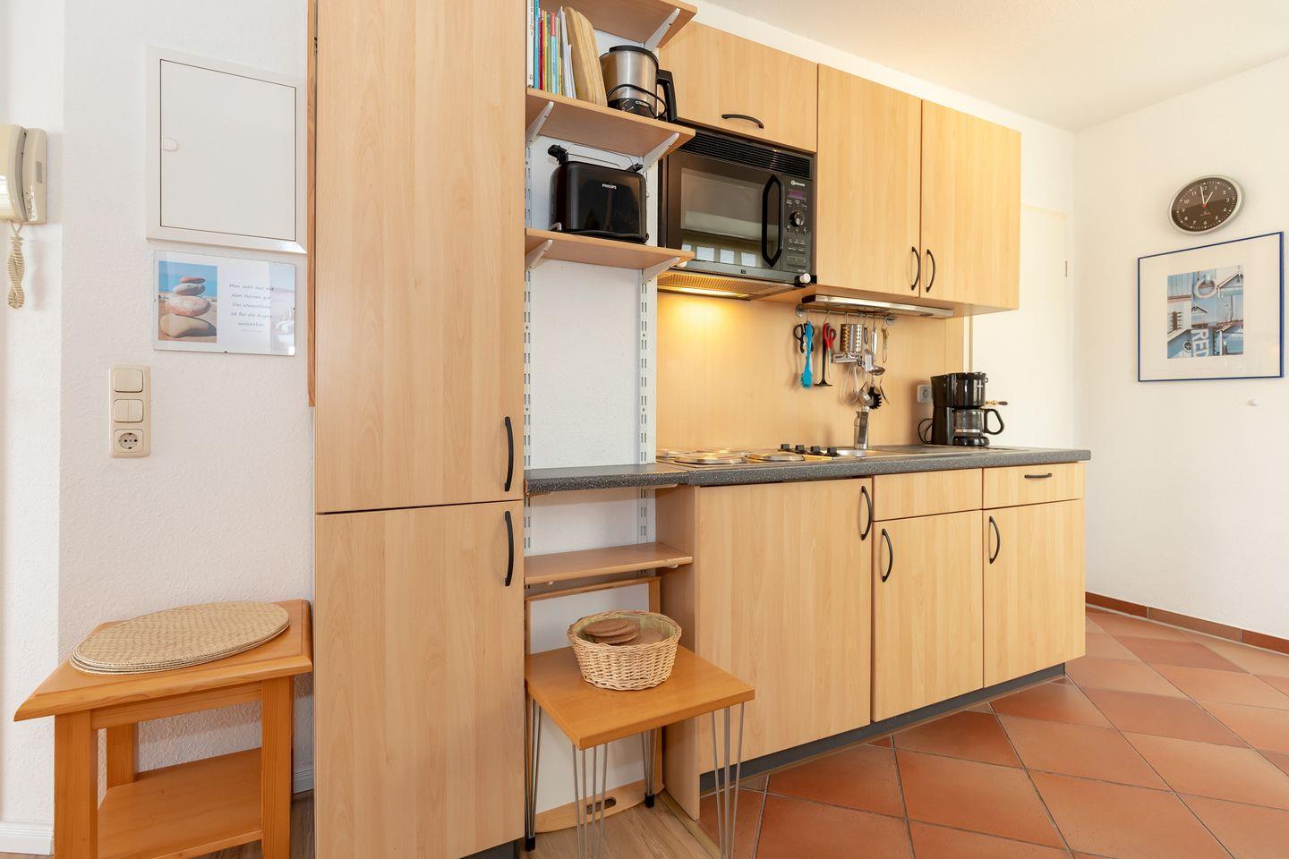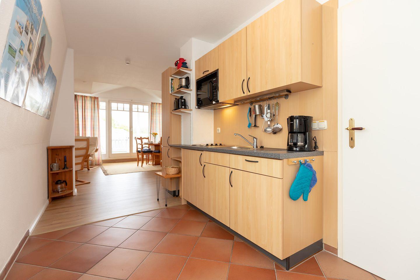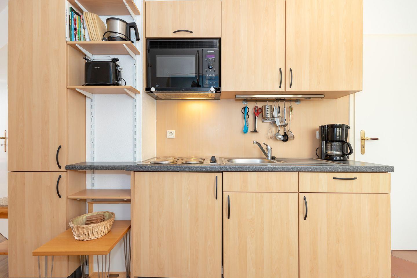 Die offene Küche beinhaltet eine voll ausgestattete Einbauküchenzeile mit 4-Zonen-Ceran-Feld, Grill-Backofen mit integrierter Mikrowelle, Kühlschrank, Kaffeemaschine, Wasserkocher und Toaster. Die Küche ist mit Geschirr, Gläsern, Besteck und Töpfen komplett ausgestattet.