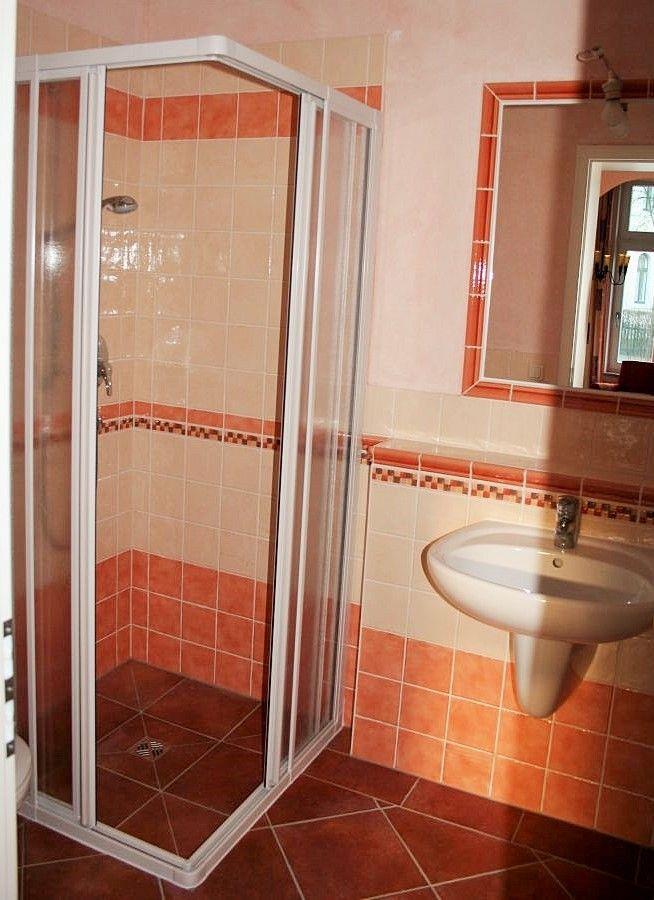 Das mediterran anmutende Badezimmer verfügt über eine Dusche mit niedrigem Einstieg (seniorenfreundlich(!), Waschbecken, WC sowie ausreichend Ablagemöglichkeiten.