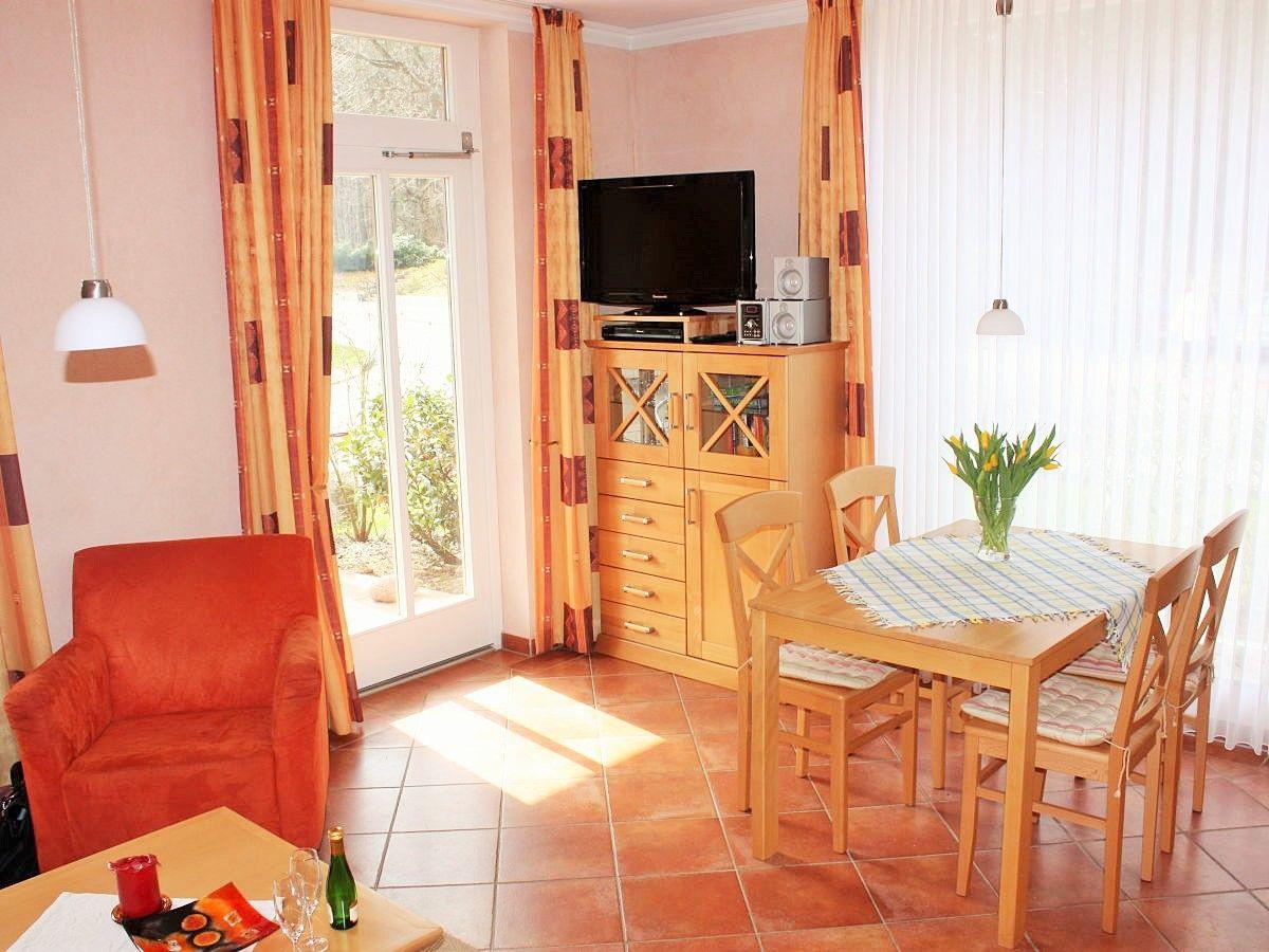 Das freundliche und gemütliche Wohn-/Esszimmer verfügt über eine separate Sitzgruppe mit bequemer Couch, 2 Sesseln und Couchtisch, einen separaten Esstisch mit 4 Stühlen sowie ein Sideboard.