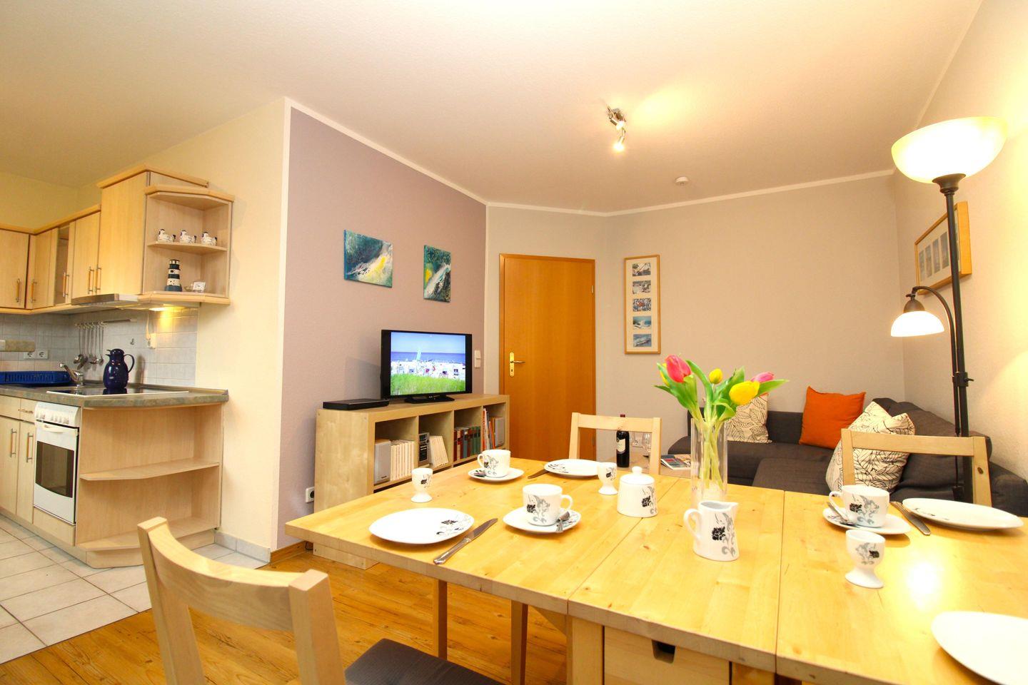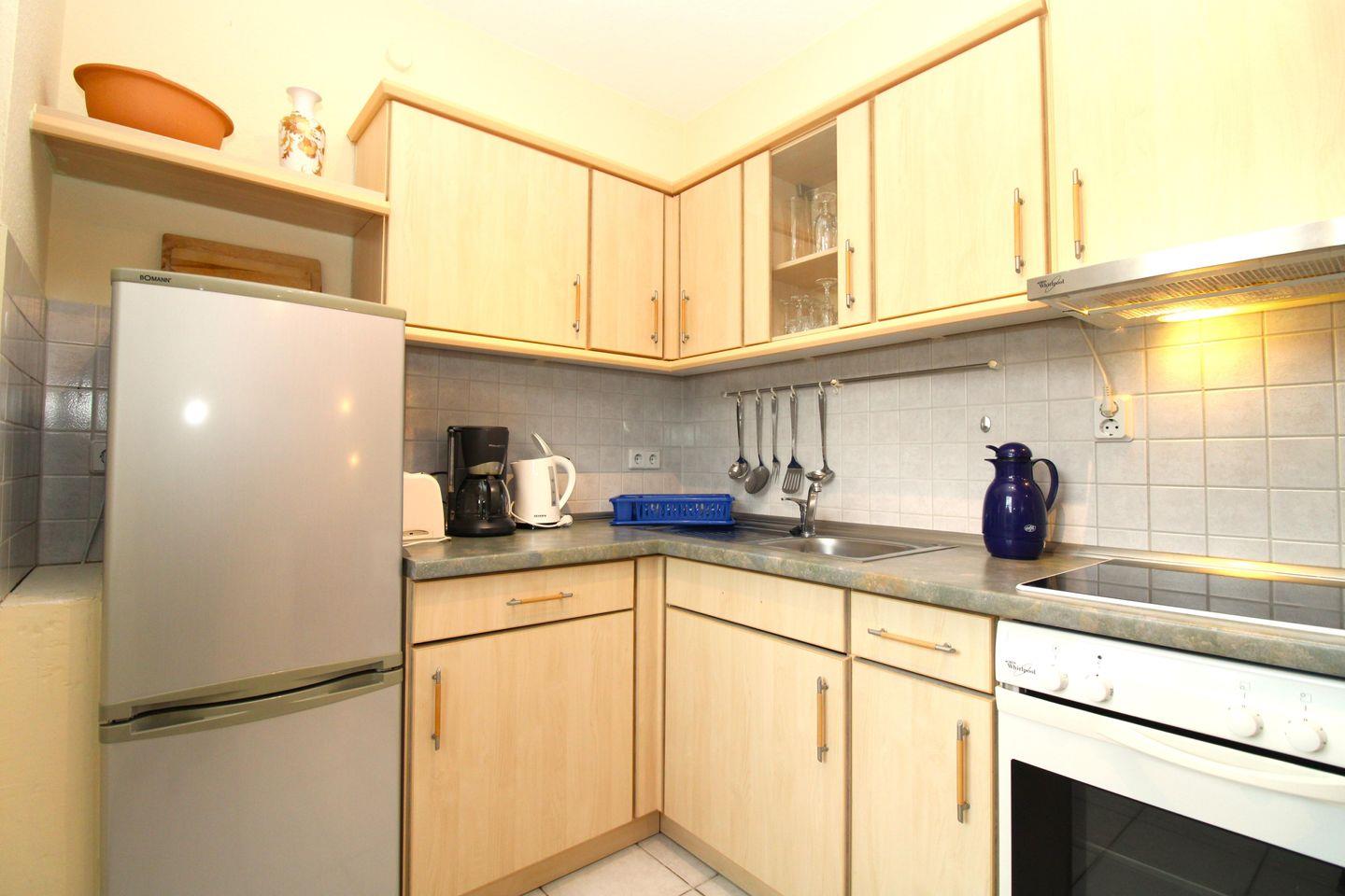 Die halb offene Küche beinhaltet eine voll ausgestattete Einbauküchenzeile mit 4-Platten-Ceran-Kochfeld, Backofen, Dunstabzug, Kühlschrank mit zusätzlichem Gefrierschrank, Kaffeemaschine, Wasserkocher und Toaster. Die Küche ist mit Geschirr, Gläsern, Besteck und Töpfen bestens und ausreichend ausgestattet.