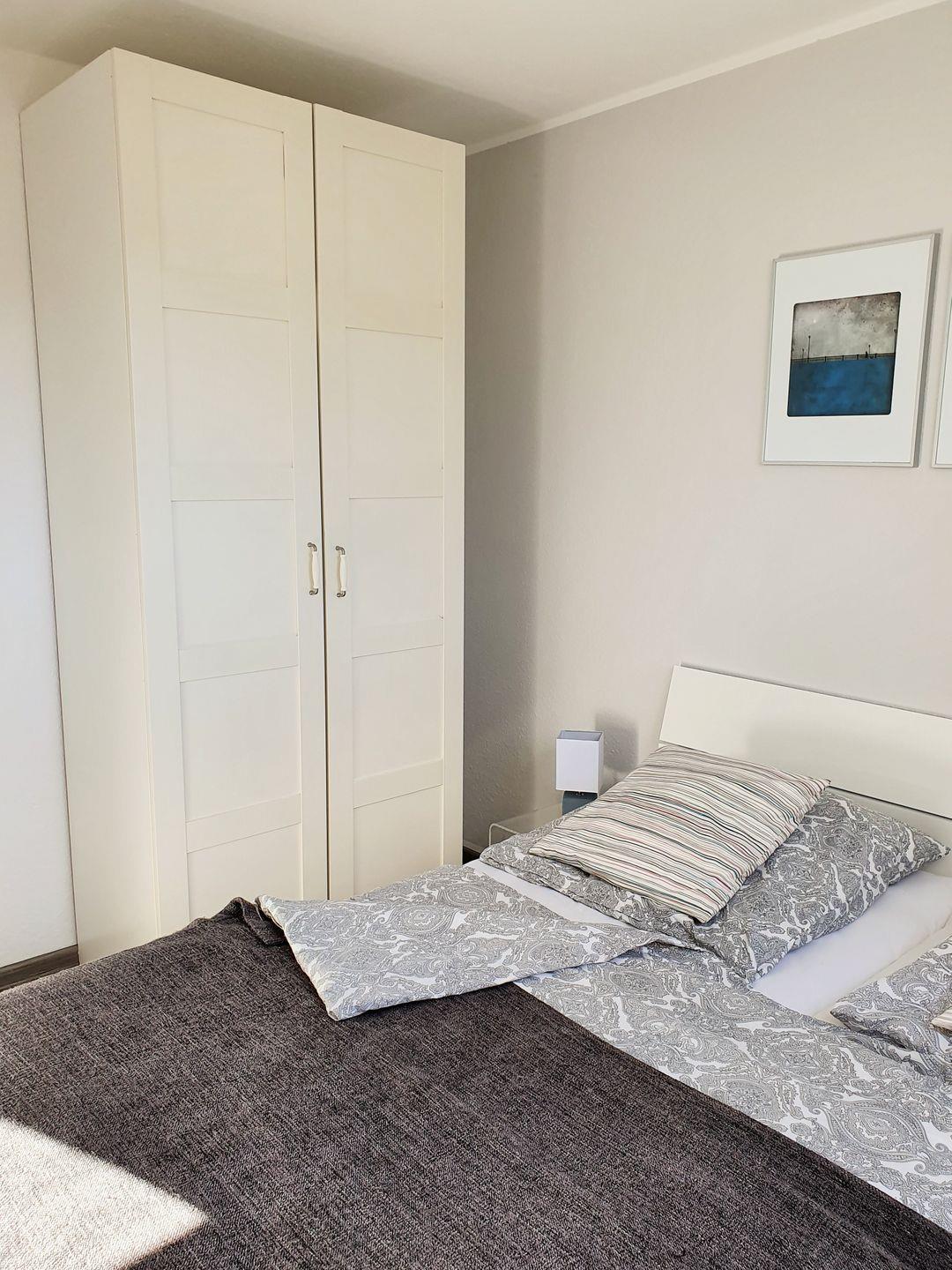 Das Schlafzimmer ist mit einem bequemen Doppelbett, Nachttischen sowie einem geräumigen Kleiderschrank eingerichtet.
