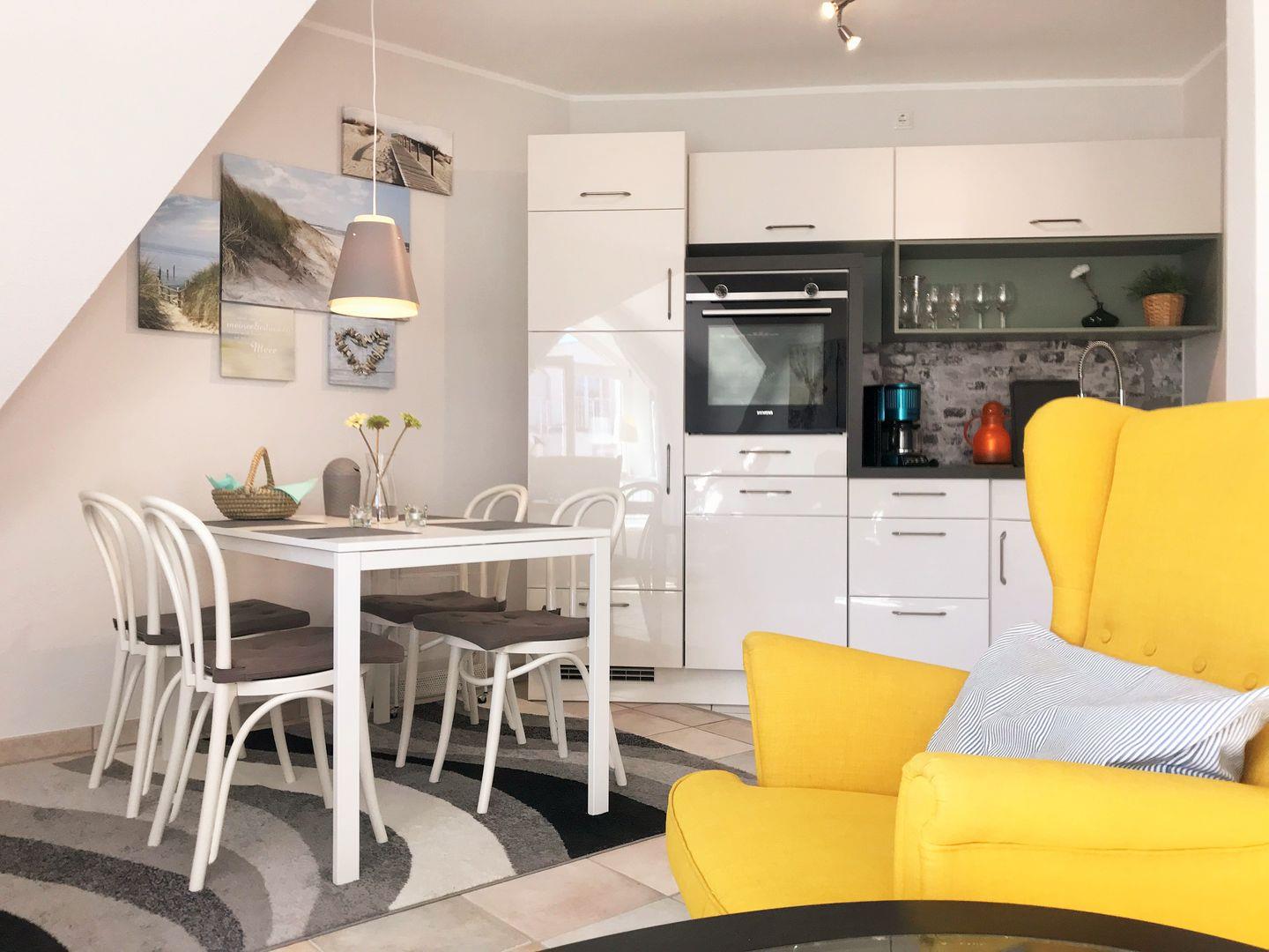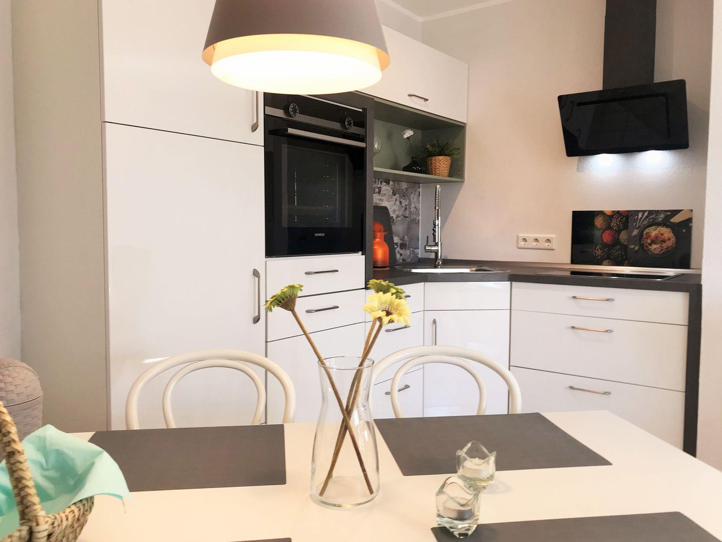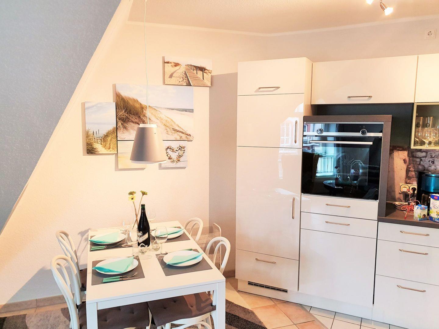Die an den Essbereich angrenzende offene Küche beinhaltet eine voll ausgestattete moderne Einbauküchenzeile mit 4-Zonen-Ceran-Kochfeld, Backofen, Dunstabzug, Geschirrspüler, Kühlschrank mit Gefrierfach, Kaffeemaschine, Wasserkocher und Toaster. Die Küche ist mit Geschirr, Gläsern, Besteck und Töpfen komplett ausgestattet.