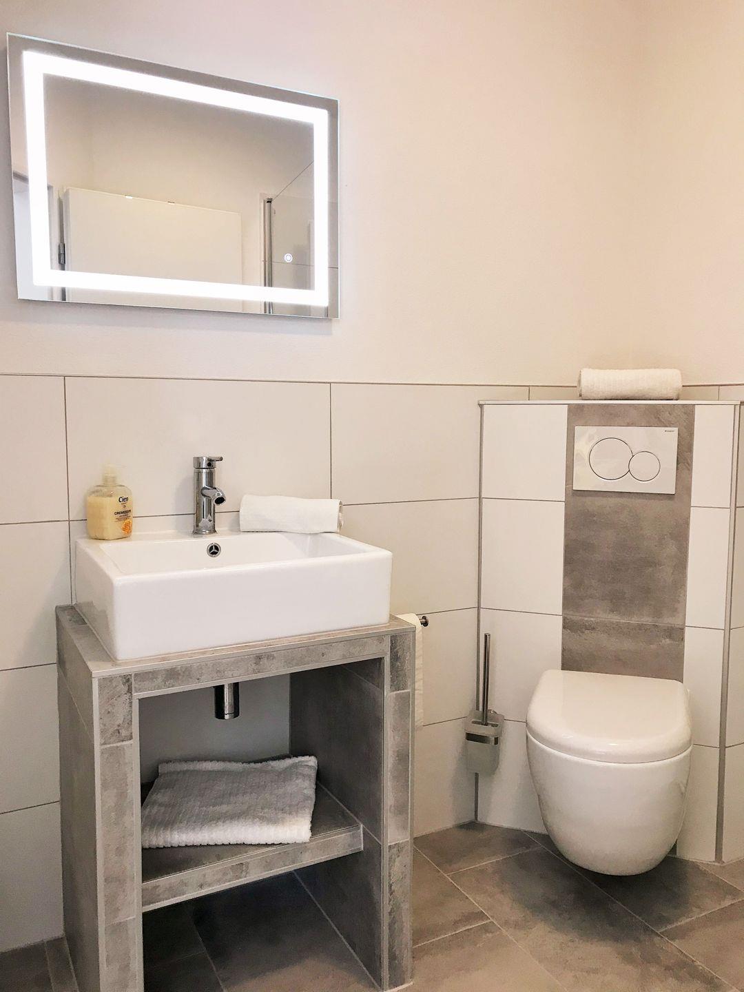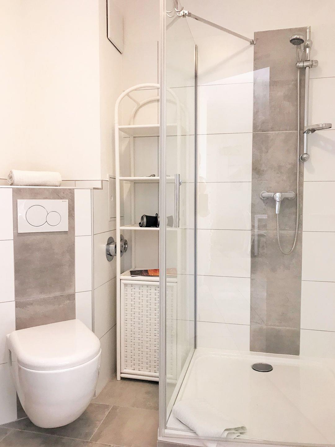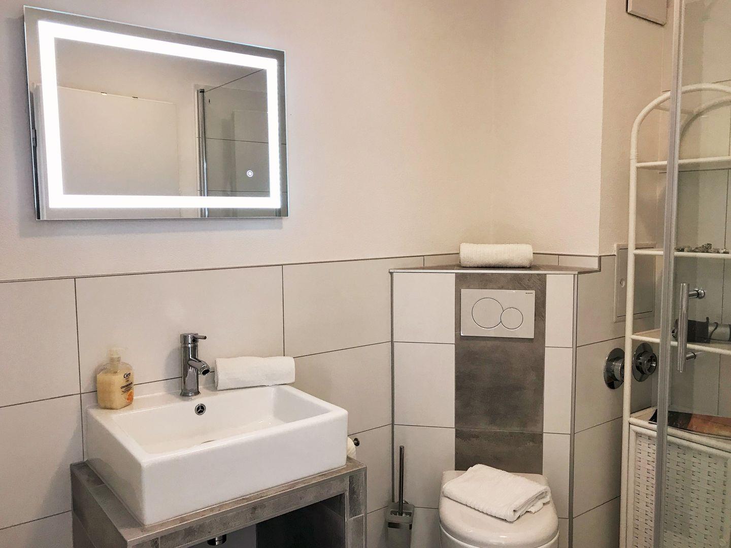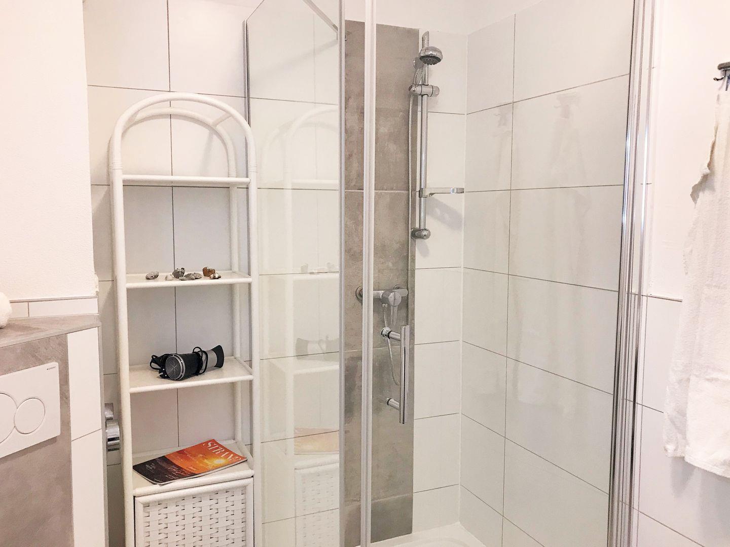 Das moderne Badezimmer verfügt über eine Echtglas-Dusche mit niedrigem Einstieg, Waschbecken, WC sowie einen Badezimmerschrank mit ausreichend Ablagemöglichkeiten.