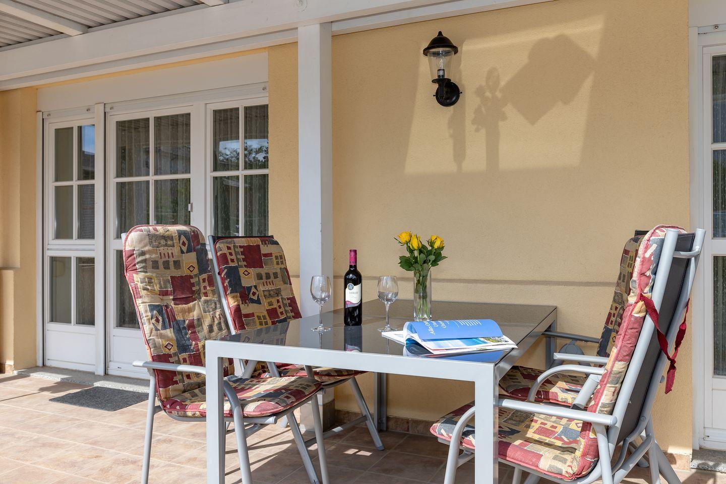 Die Wohnung verfügt über 2 ebenerdige - nach Osten (Morgensonne!) und teilweise Süden bzw. nach Westen ausgerichtete - große und teilweise überdachte Terrassen (ca. 15 m² bzw. 40 m²), die Sie vom Wohnzimmer bzw. den beiden Schlafzimmern aus erreichen. Auf der Wohnzimmerterrasse steht Ihnen darüber hinaus ein Strandkorb zur Verfügung. Hier sitzen Sie entspannt und können bei einer guten Flasche Wein die lauen Sommernächte genießen!