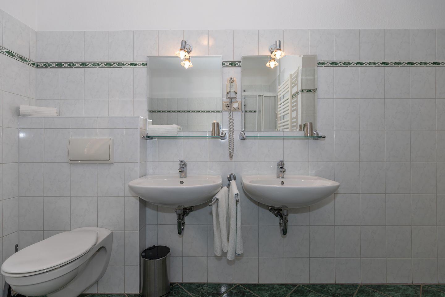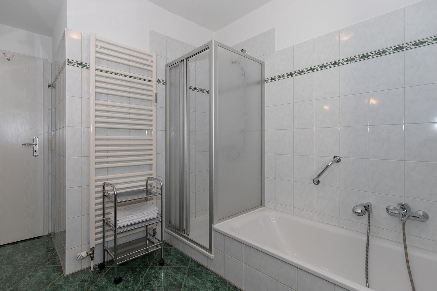 Das große und moderne Badezimmer (mit Fenster / Tageslicht!) verfügt über Dusche und Badewanne, 2 Waschbecken, WC, Handtuch-Heizkörper sowie ausreichend Ablage-möglichkeiten. Darüber hinaus hat die Wohnung eine zusätzliche Gästetoilette.