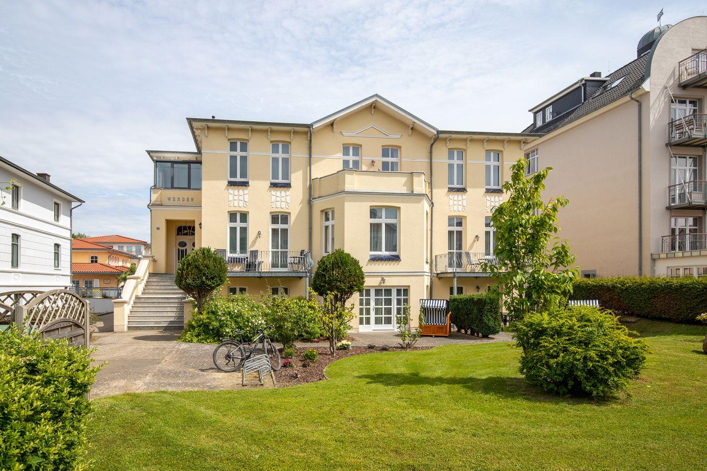 • 2 ebenerdige Terrassen mit Strandkorb und großer Liegewiese