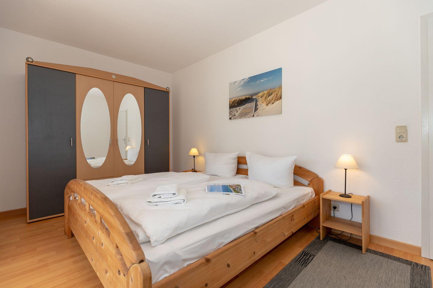 Das separate 2. Schlafzimmer ist ebenfalls mit einem bequemen Doppelbett, Nachttischen und einem Kleiderschrank eingerichtet.