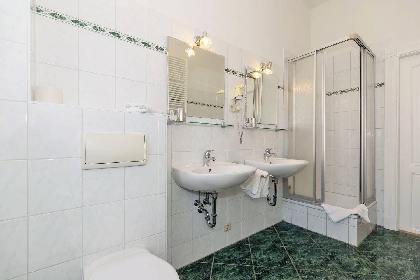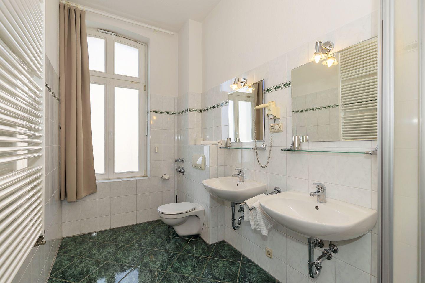 Das moderne und helle Badezimmer (mit Fenster / Tageslicht!) verfügt über eine Dusche, 2 Waschbecken, WC, Handtuch-Heizkörper sowie ausreichend Ablagemöglichkeiten.