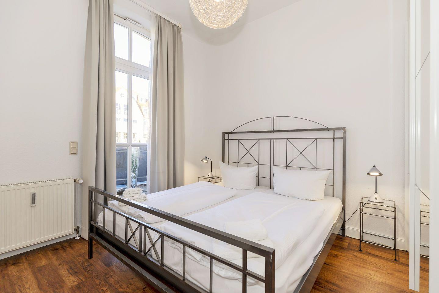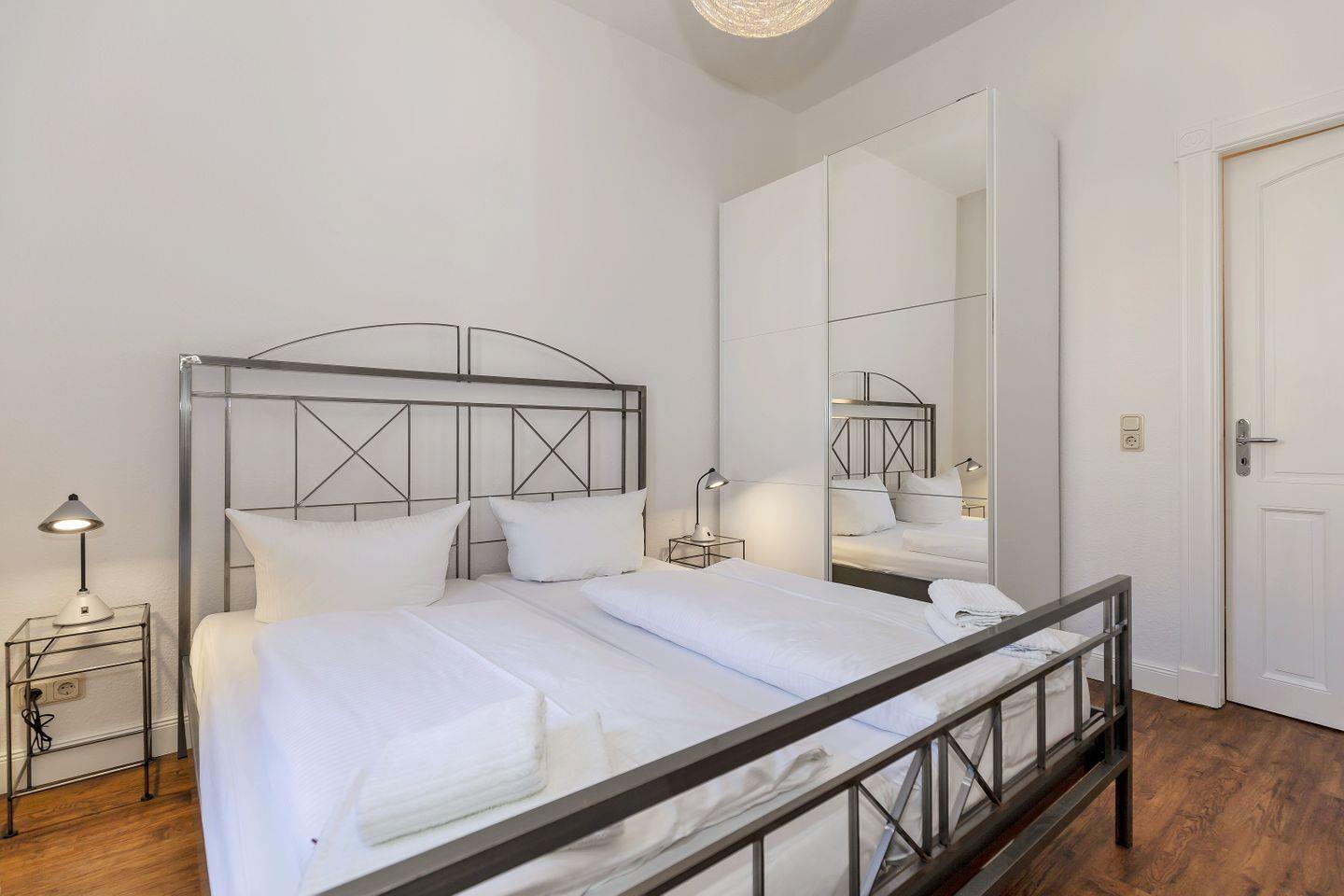 Das moderne und freundliche Schlafzimmer ist mit einem bequemen Doppelbett, Nachttischen sowie einem geräumigen Kleiderschrank eingerichtet.
