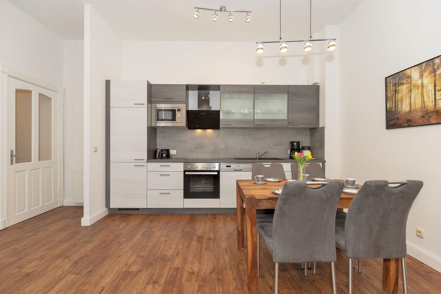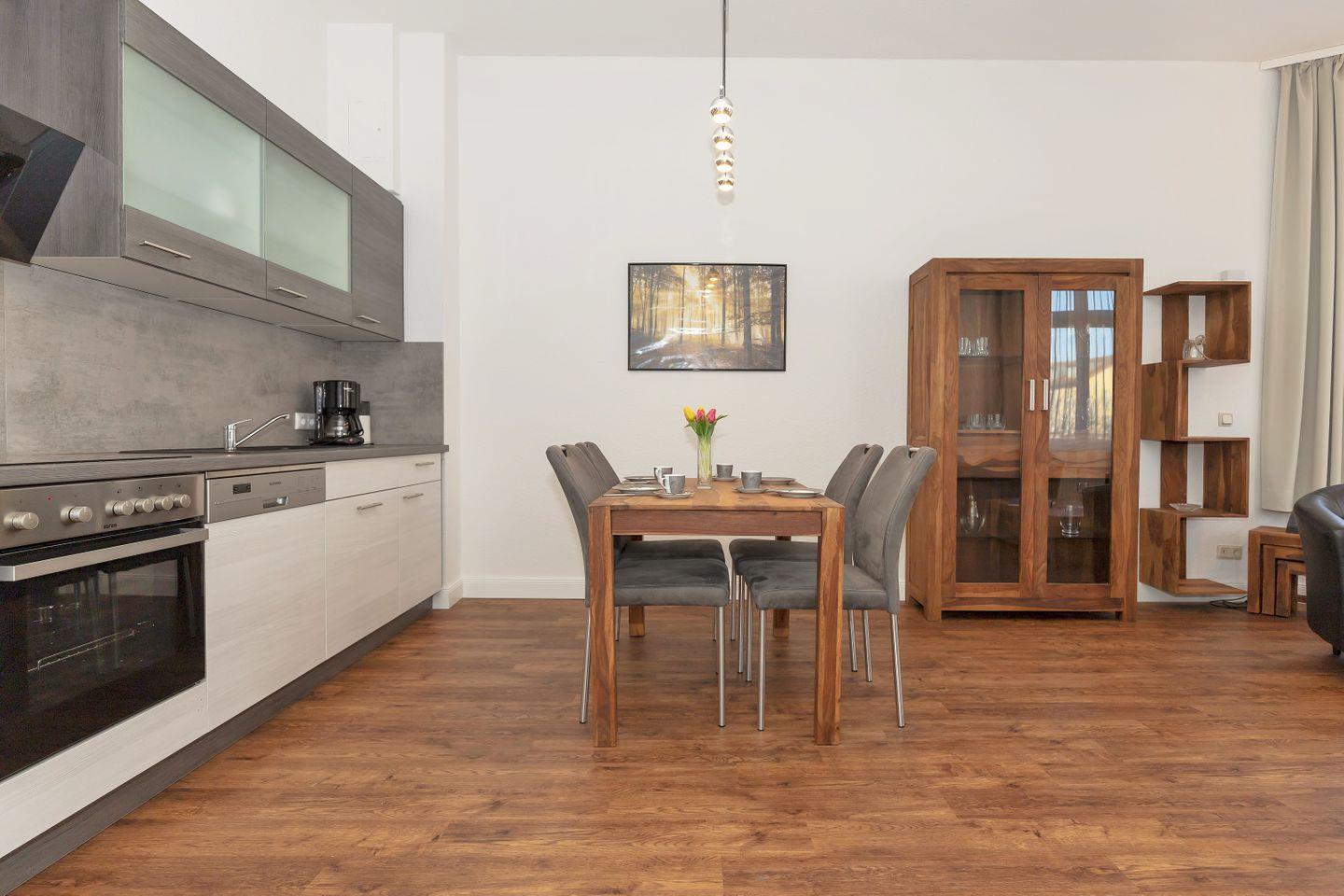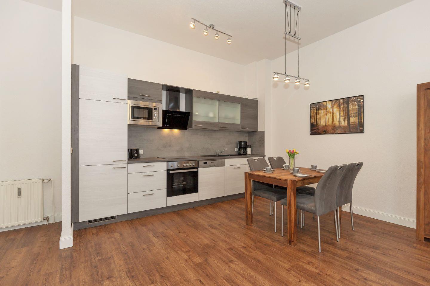 Der an den Essbereich angrenzende offene Küchenbereich beinhaltet eine moderne und komplett ausgestattete Einbauküchenzeile mit 4-Zonen-Ceran-Kochfeld, Dunstabzug, Backofen, Mikrowelle, Kühlschrank mit Gefrierfach, Geschirrspülmaschine, Kaffeemaschine, Wasserkocher und Toaster. Die Küche ist mit Geschirr, Gläsern, Besteck und Töpfen bestens und vollständig ausgestattet.
