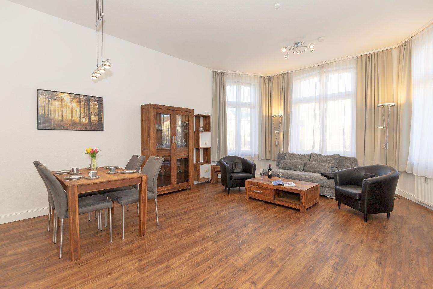 Das geräumige Wohn-/Esszimmer ist mit einer separaten Sitzgruppe mit einer bequemen (und ausziehbaren Schlaf-) Couch, Couchtisch und 2 Sesseln, einem separaten Esstisch mit 4 Stühlen sowie einer modernen Anbauwand eingerichtet.