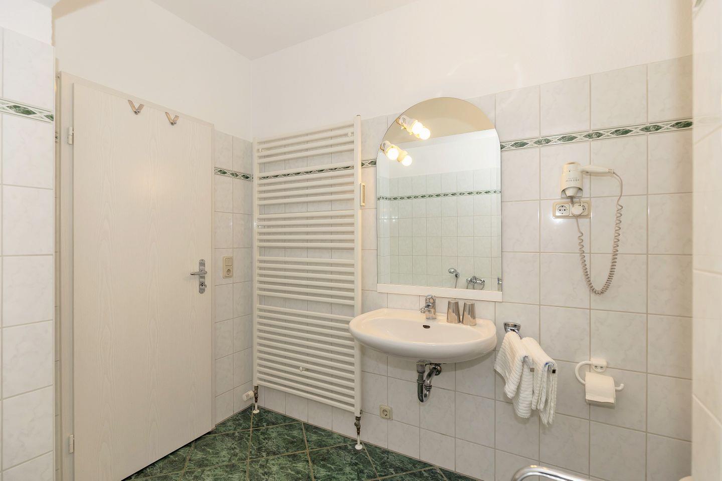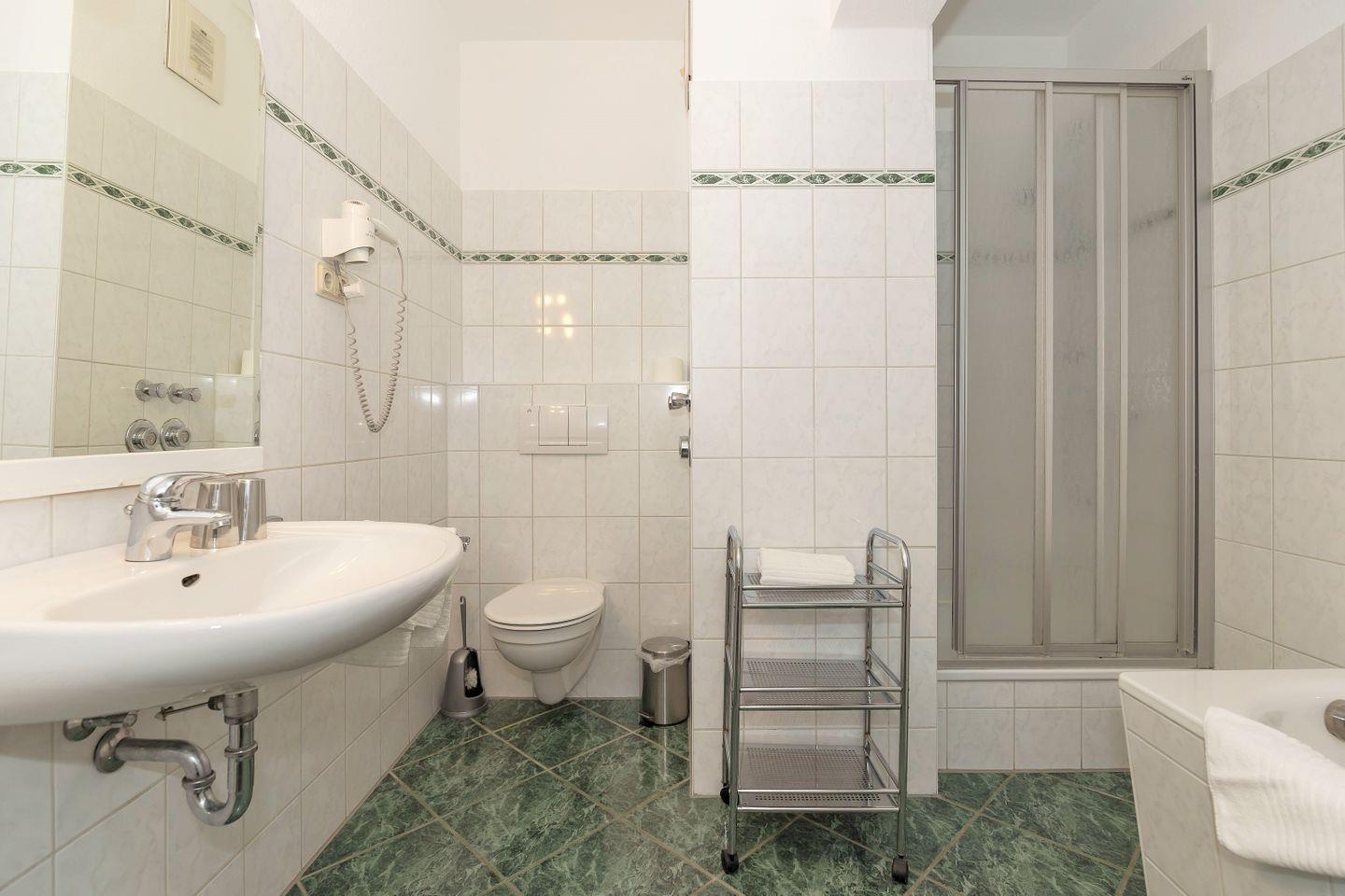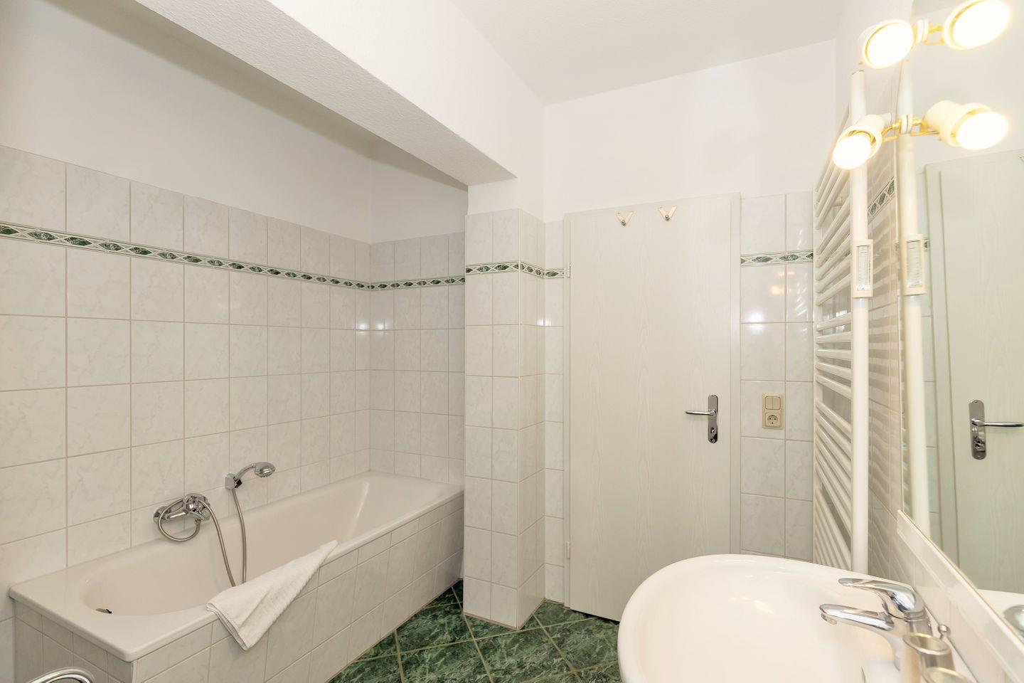 Das große und moderne Badezimmer verfügt über Dusche und Badewanne, Waschbecken mit Spiegelschrank, WC, Handtuch-Heizkörper sowie ausreichend Ablagemöglichkeiten.