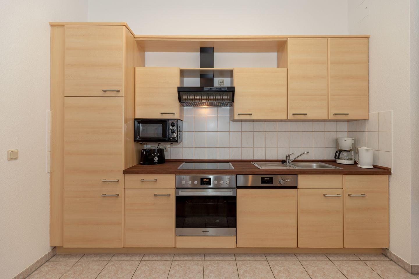 Der an den Essbereich angrenzende offene Küchenbereich beinhaltet eine komplett aus- gestattete Einbauküchenzeile mit 4-Zonen-Ceran-Kochfeld, Dunstabzug, Backofen und Mikrowelle, Kühlschrank mit Gefrierfach, Geschirrspülmaschine, Kaffeemaschine, Wasserkocher und Toaster. Die Küche ist mit Geschirr, Gläsern, Besteck und Töpfen bestens und vollständig ausgestattet.
