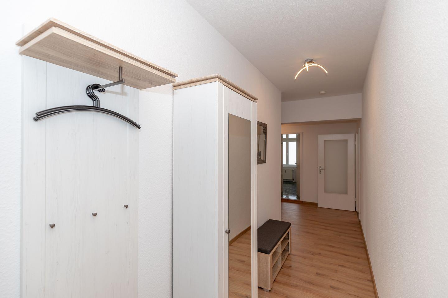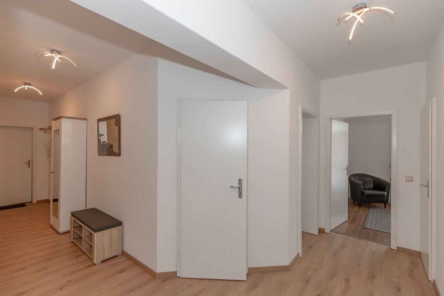 Vom großzügigen Flur mit Garderobe, Spiegel, Schrank, Sitzbank und Schuhschrank erreichen Sie bequem alle Räume Ihrer Ferienwohnung.