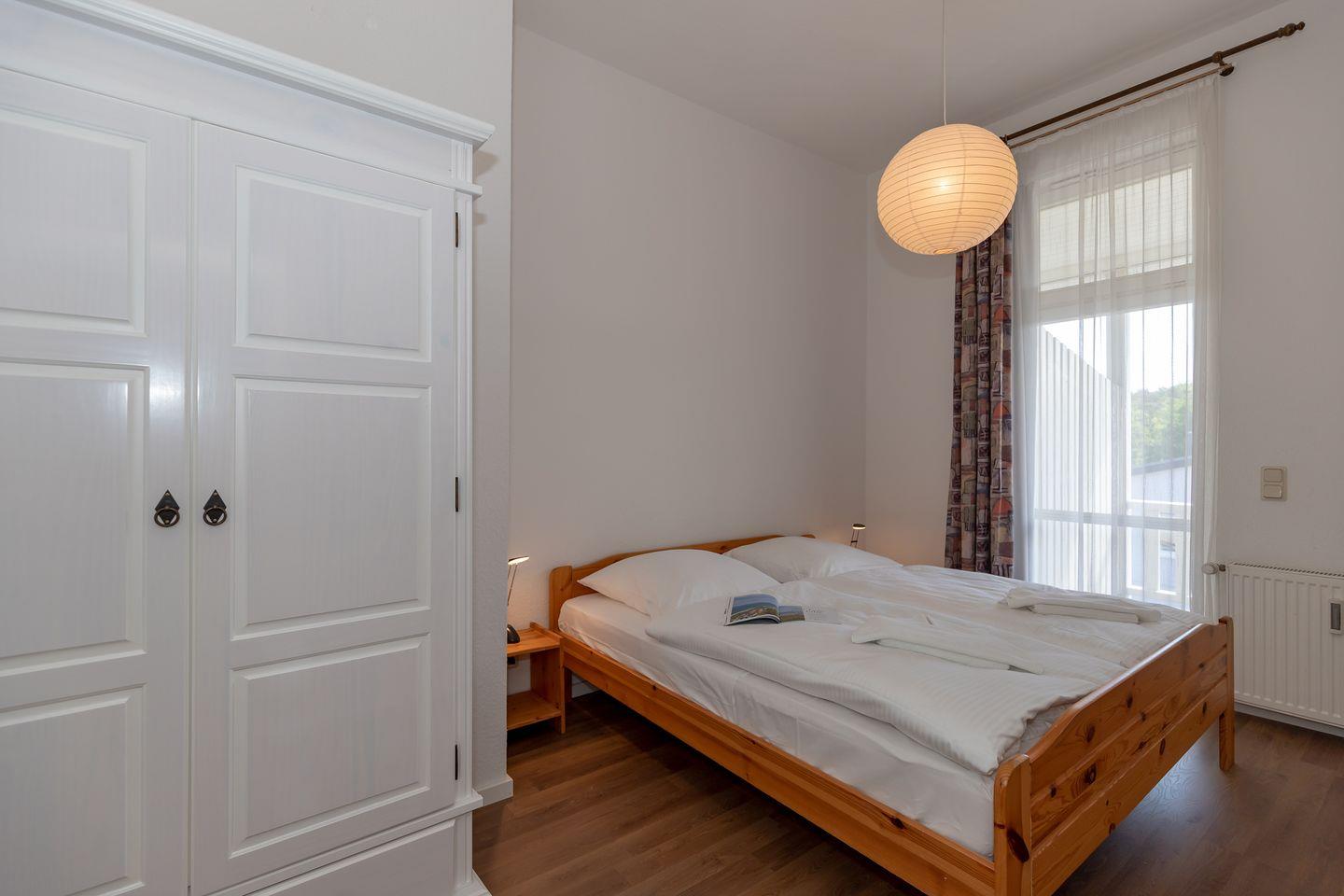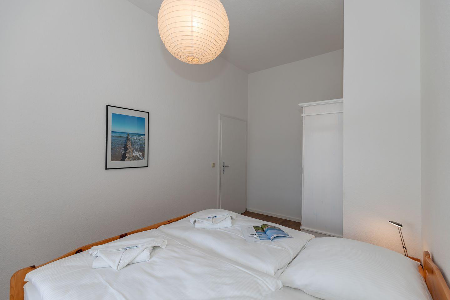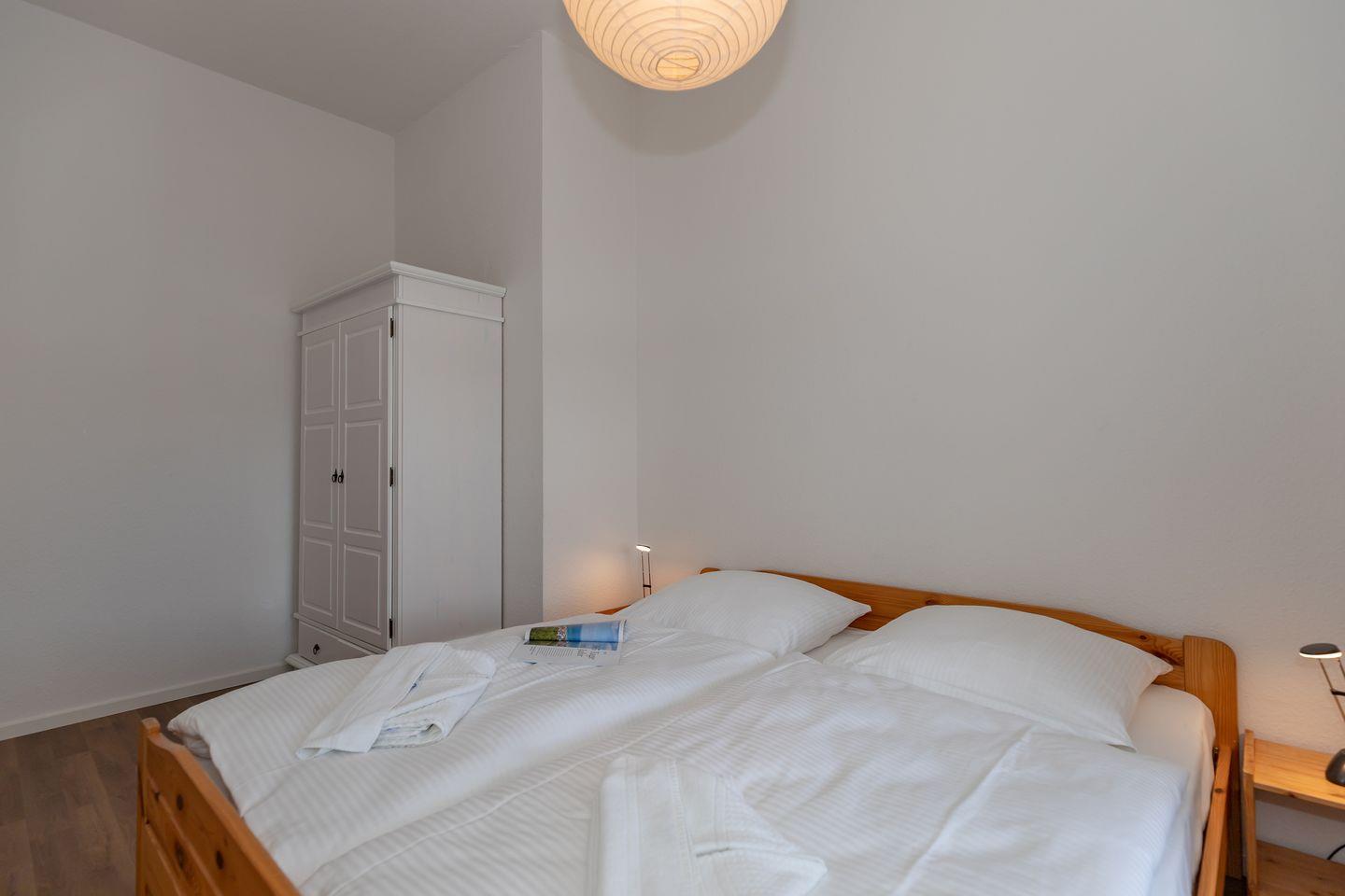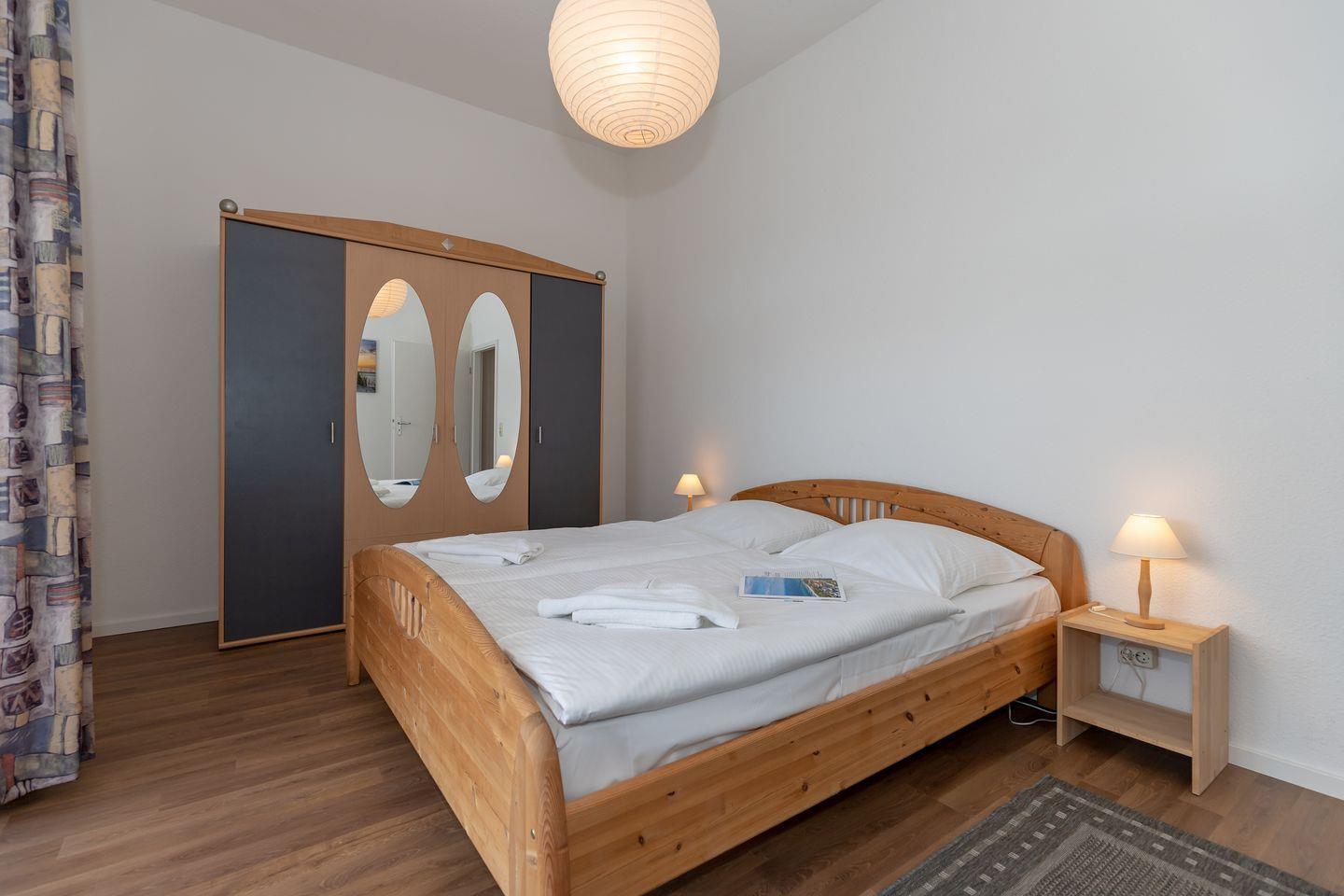 Das separate 2. Schlafzimmer ist ebenfalls mit einem bequemen Doppelbett, Nachttischen und einem Kleiderschrank eingerichtet.