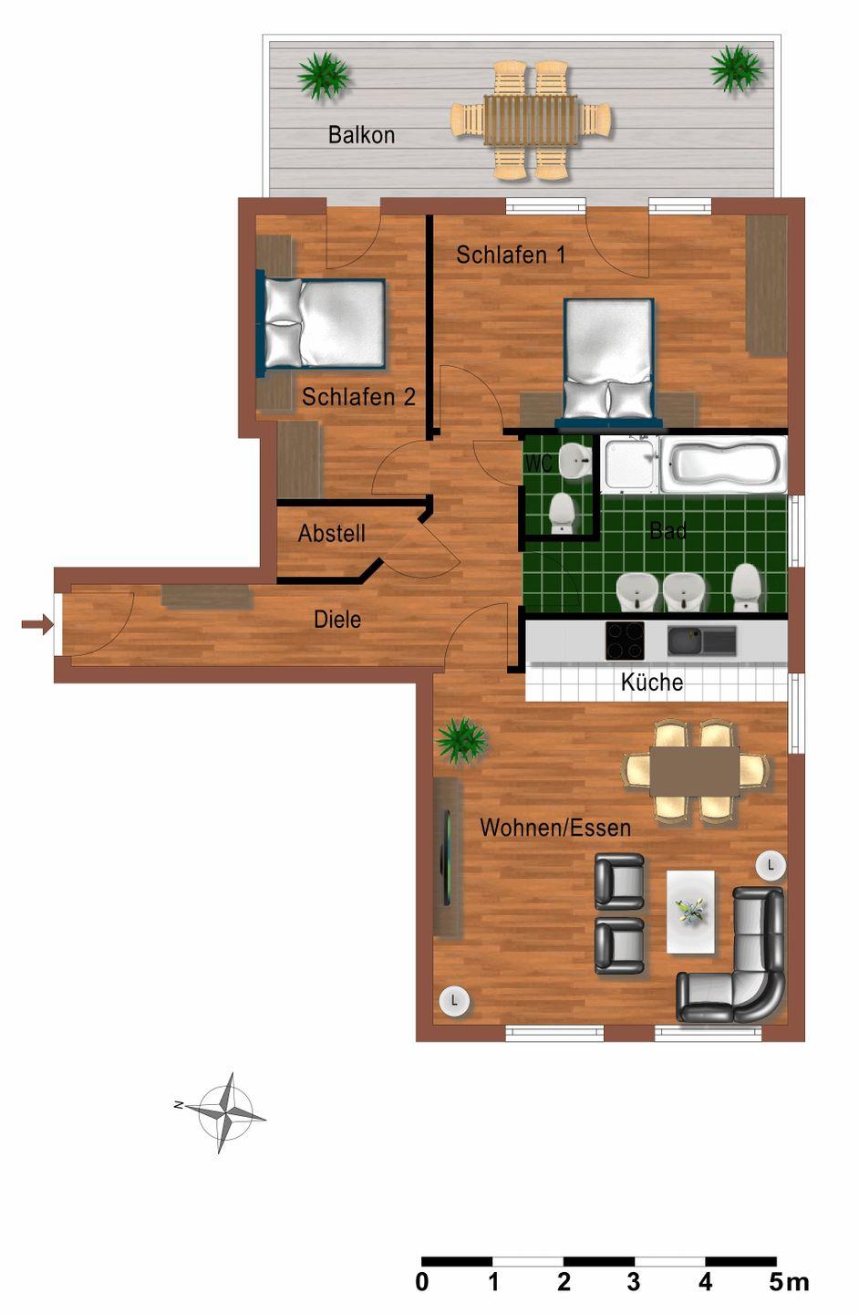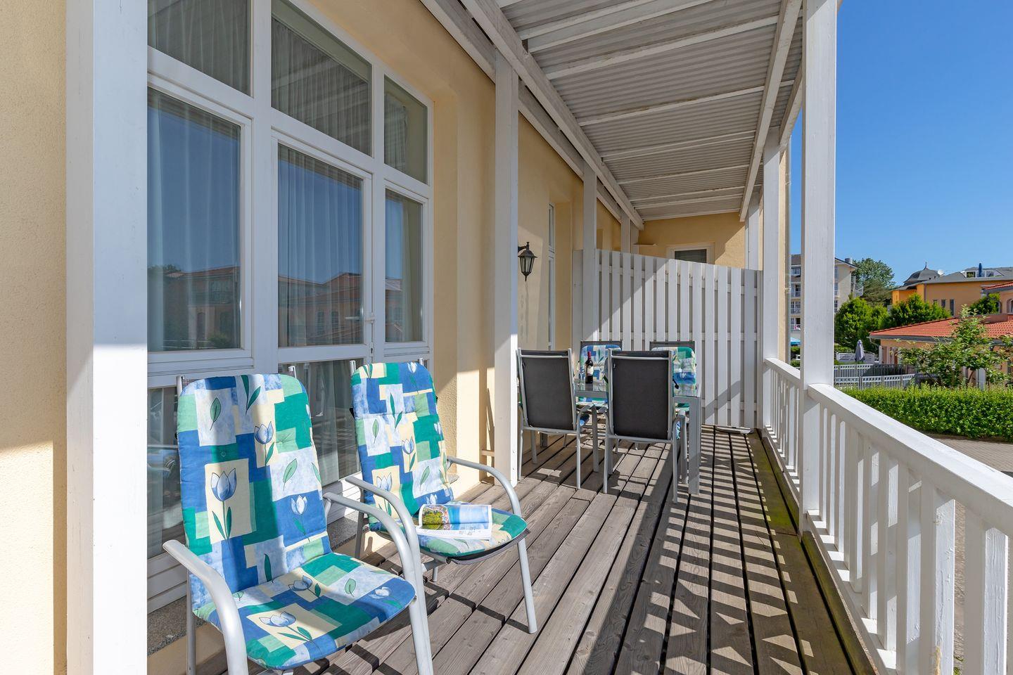 Die Wohnung verfügt über einen sehr schönen - nach Osten (Morgensonne!) und teilweise Süden bzw. nach Westen ausgerichteten - großen und überdachten Balkon (ca. 15 m²), den Sie von den beiden Schlafzimmern aus erreichen. Hier sitzen Sie entspannt und können bei einer guten Flasche Wein die lauen Sommernächte genießen!