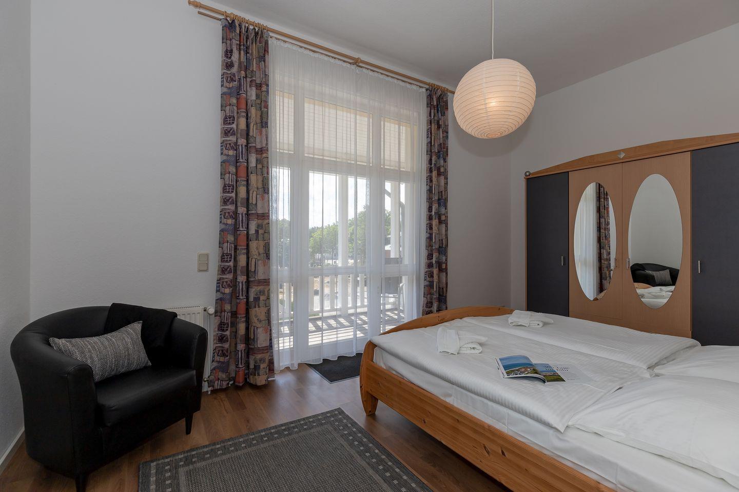 Das großzügige 1. Schlafzimmer ist mit einem bequemen Doppelbett, Nachttischen, einem Sessel sowie einem geräumigen Kleiderschrank eingerichtet.
