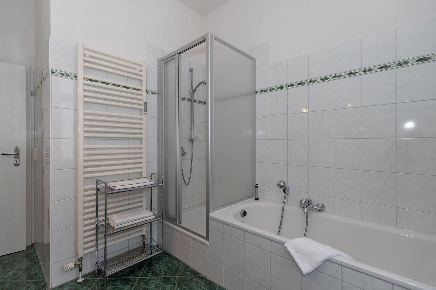 Das große und moderne Badezimmer (mit Fenster / Tageslicht!) verfügt über Dusche und Badewanne, 2 Waschbecken, WC, Handtuch-Heizkörper sowie ausreichend Ablage-möglichkeiten. Darüber hinaus hat die Wohnung eine zusätzliche Gästetoilette.