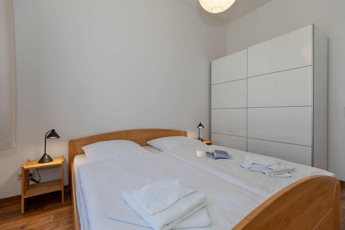 Das großzügige und moderne Schlafzimmer ist mit einem bequemen Doppelbett, Nachttischen sowie einem geräumigen Kleiderschrank eingerichtet. Eine zusätzliche bequeme Schlafmöglichkeit für eine weitere 3. bzw. 4. Person bietet die ausziehbare Schlafcouch im Wohnzimmer sowie für eine 5. Person die Schlafcouch im Wintergarten.