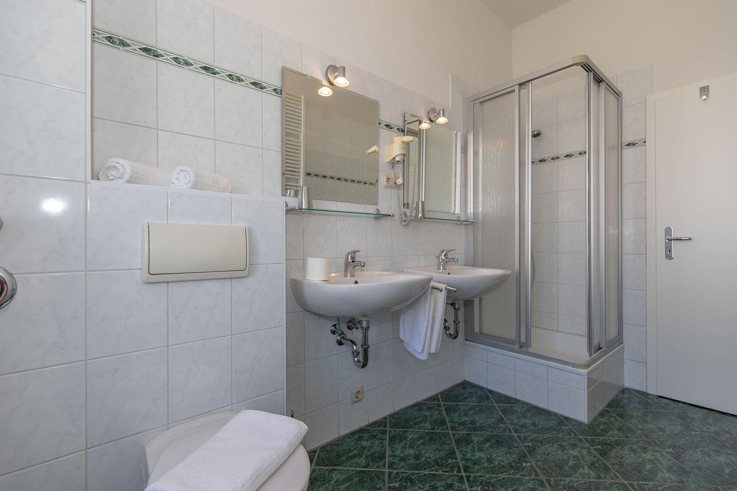 Das moderne und helle Badezimmer (mit Fenster / Tageslicht!) verfügt über eine Dusche, 2 Waschbecken, WC, Handtuch-Heizkörper sowie ausreichend Ablagemöglichkeiten.