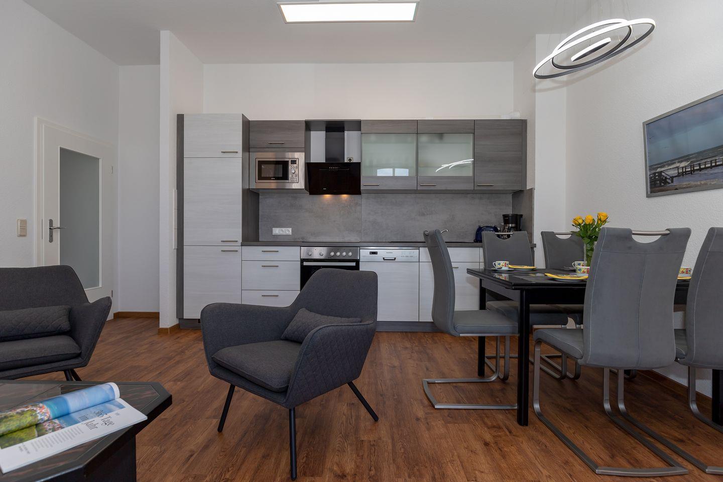 Der an den Essbereich angrenzende offene Küchenbereich beinhaltet eine neue und moderne komplett ausgestattete Einbauküchenzeile mit 4-Zonen-Ceran-Kochfeld, Dunstabzug, Backofen und Mikrowelle, Kühlschrank mit Gefrierfach, Geschirrspülmaschine, Kaffeemaschine, Wasserkocher und Toaster. Die Küche ist mit Geschirr, Gläsern, Besteck und Töpfen bestens und vollständig ausgestattet.