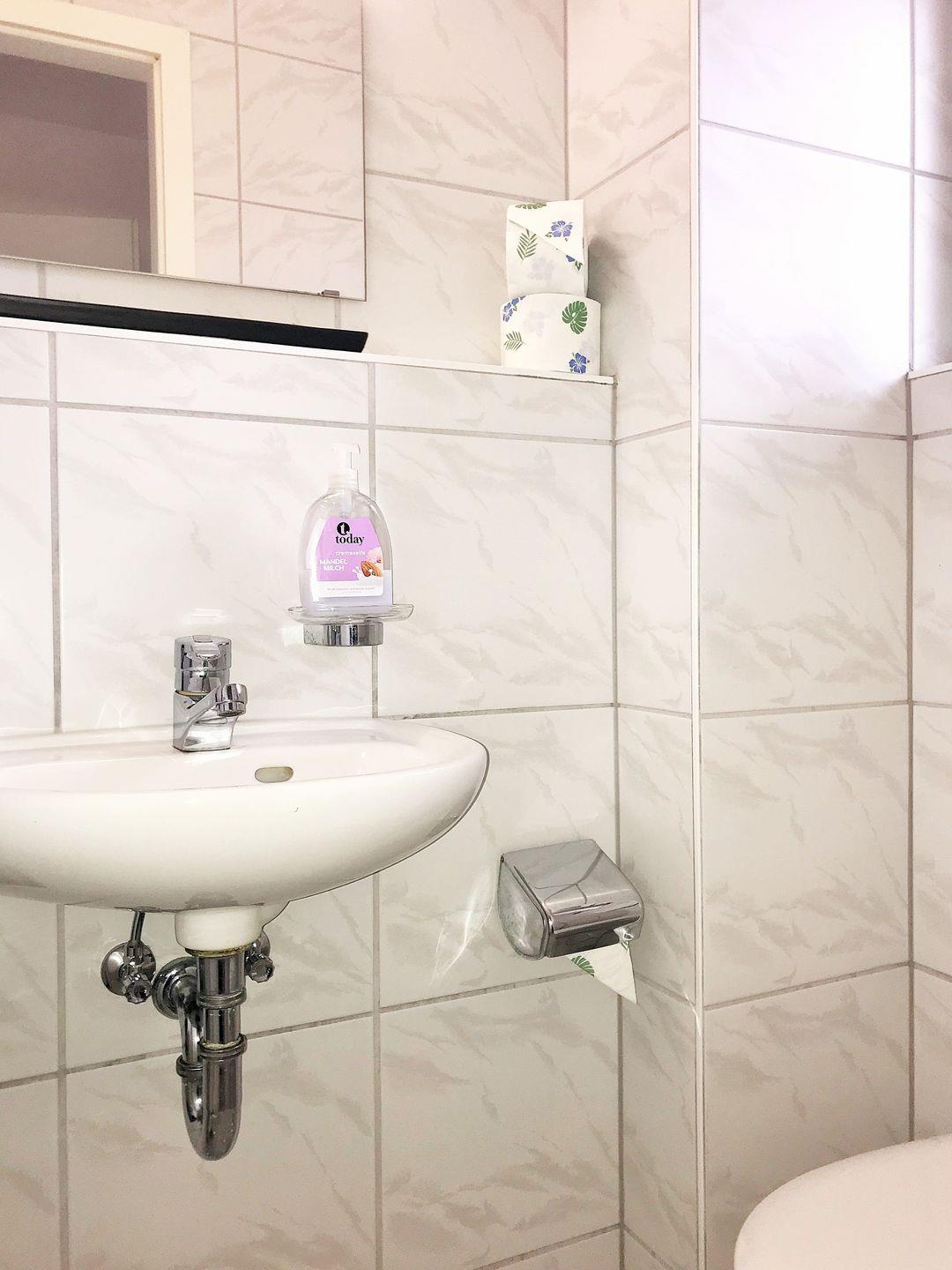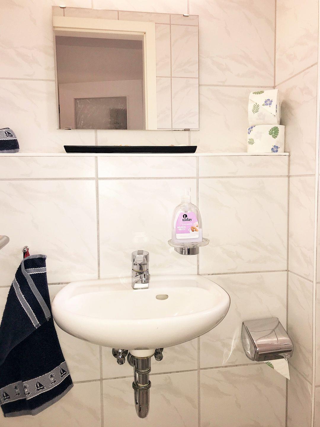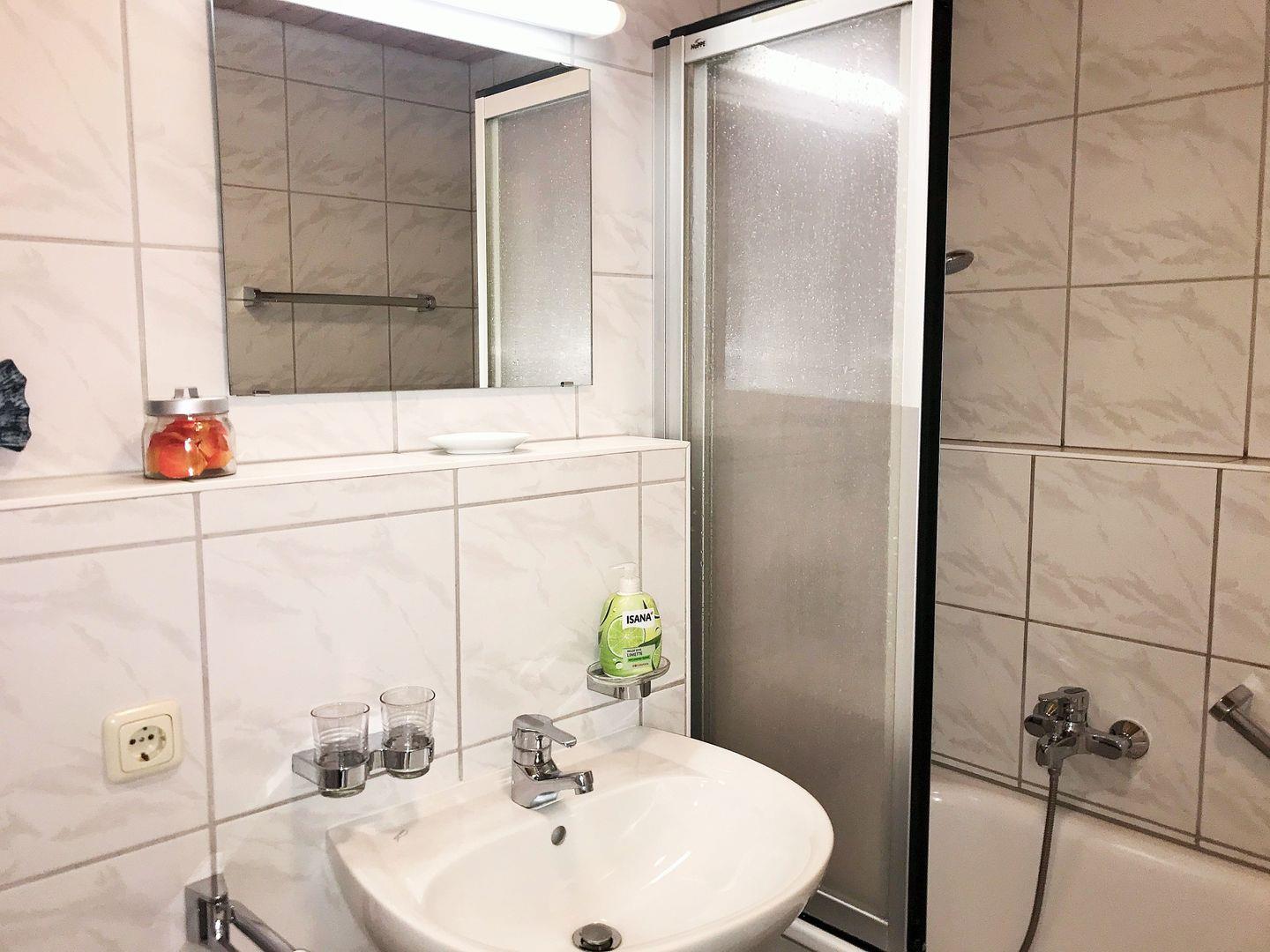 Das freundliche Badezimmer verfügt über eine Badewanne mit Duschabtrennung, Waschbecken, WC, Föhn, Handtuch-Heizkörper sowie ausreichend Ablagemöglichkeiten. In der unteren Etage befindet sich noch eine zusätzliche Gäste-Toilette mit Waschbecken, WC und Tageslicht (Fenster).
