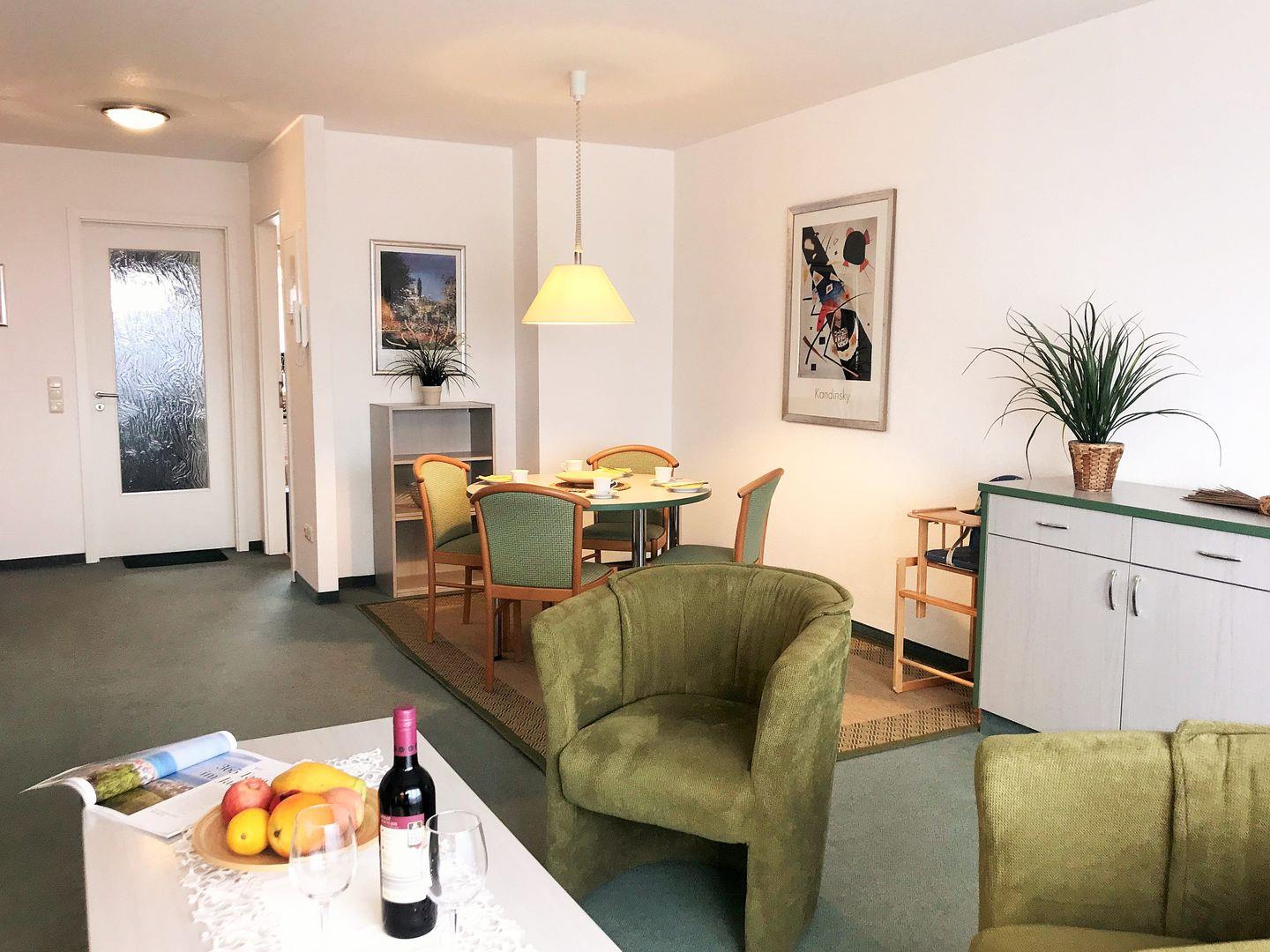 Das großzügige Wohn-/Esszimmer verfügt über eine separate Sitzecke mit bequemer (ausziehbarer Schlaf-) Couch, Couchtisch und 2 Sessel, einen separaten Esstisch mit 6 Stühlen sowie verschiedene Sideboards und Regale. Vom Wohnzimmer aus haben Sie Zugang zu dem seeseitigen Balkon mit Balkonmöbeln sowie traumhaftem und unverbautem Blick auf die Ostsee. Hier sitzen Sie entspannt und können das muntere Treiben auf der Ostseeallee verfolgen oder abends bei einem guten Glas Wein die lauen Sommernächte genießen!