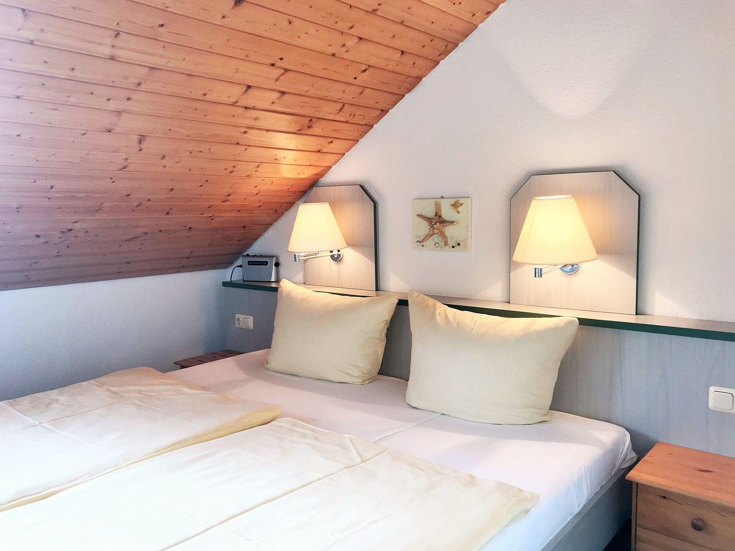 Das separate 2. Schlafzimmer ist ebenfalls mit einem bequemen Doppelbett (2 x 90 x 200 cm), Nachttischen, einem Kleiderschrank sowie einer Kommode eingerichtet. Eine zusätzliche bequeme Schlafmöglichkeit für eine weitere 5. bzw. 6. Person bietet die komfortable ausziehbare Schlafcouch im Wohnzimmer.