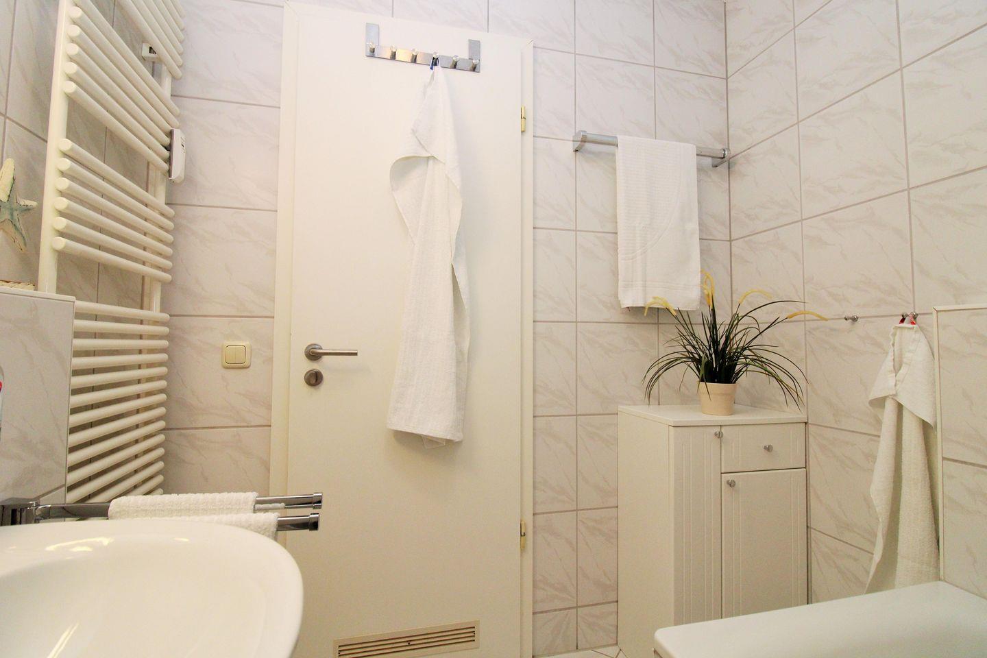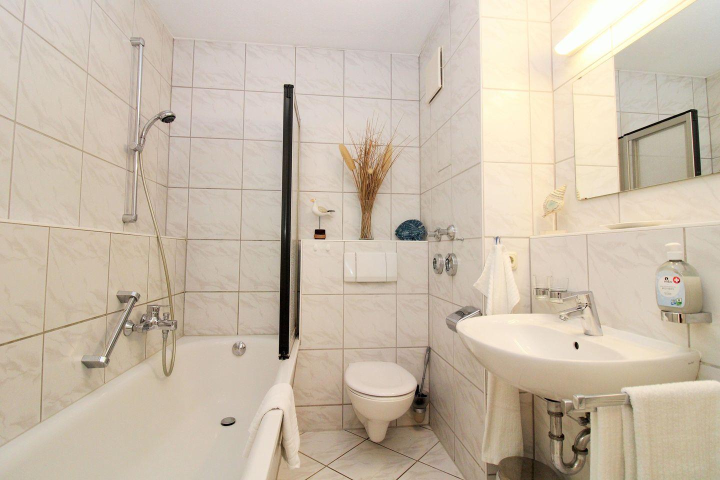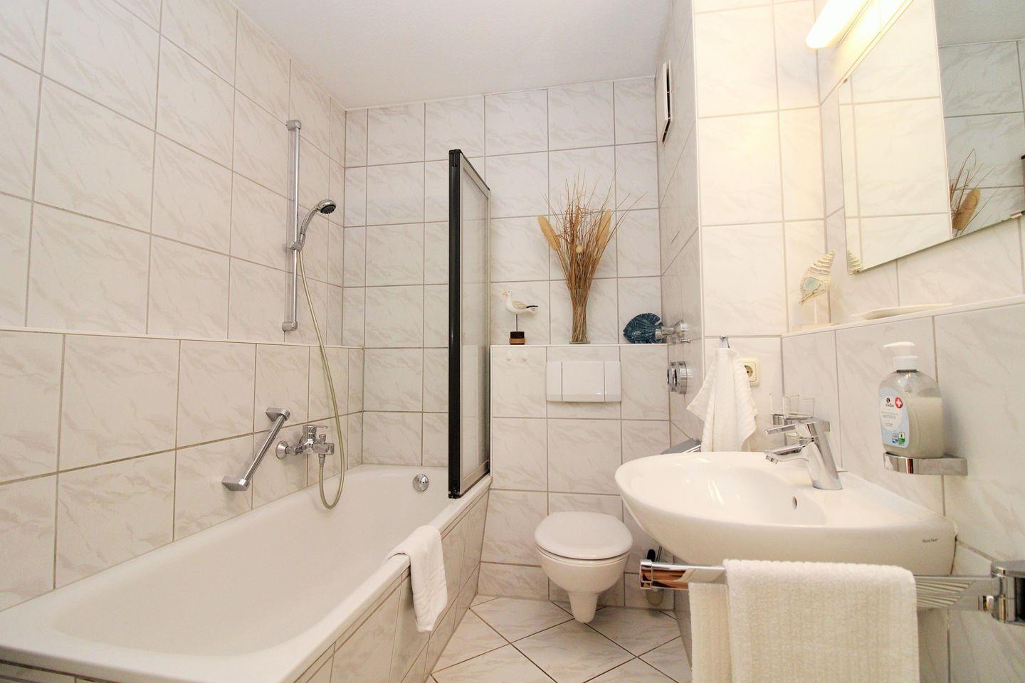 Das freundliche Badezimmer verfügt über eine Badewanne, Waschbecken, WC, eine geräumigen Badezimmerkommode, Föhn, Handtuch-Heizkörper sowie ausreichend Ablagemöglichkeiten.