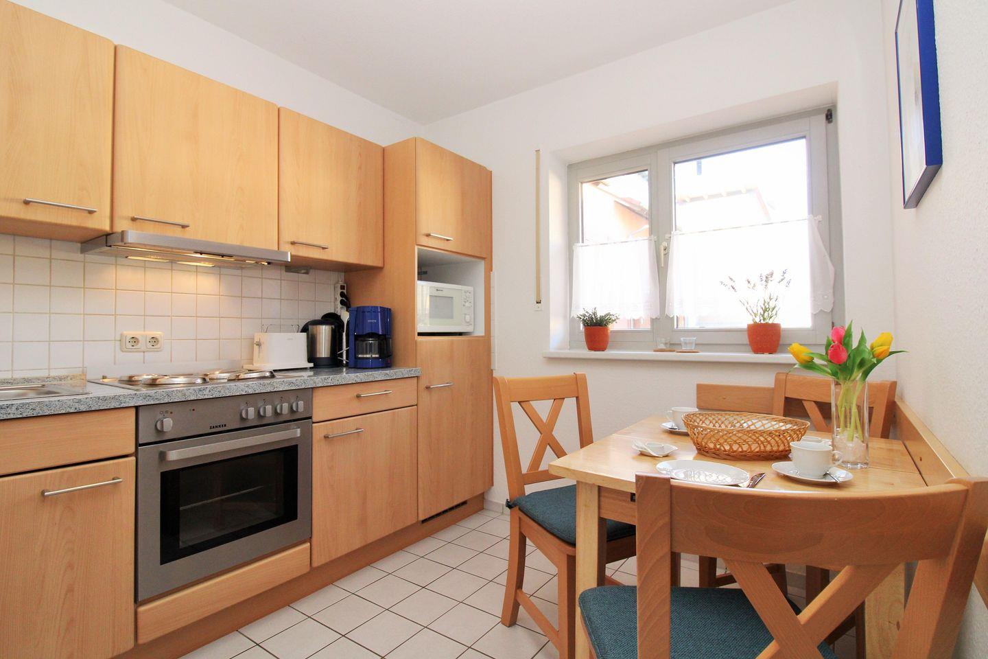 Die separate Küche beinhaltet eine voll ausgestattete Einbauküchenzeile mit 4-Platten-Herd, Backofen, Dunstabzug, Mikrowelle, Kühlschrank mit Gefrierfach, Geschirrspülmaschine, Kaffeemaschine, Wasserkocher, Toaster sowie einen separaten Esstisch mit Stühlen. Die Küche ist mit Geschirr, Gläsern, Besteck und Töpfen bestens und ausreichend ausgestattet.