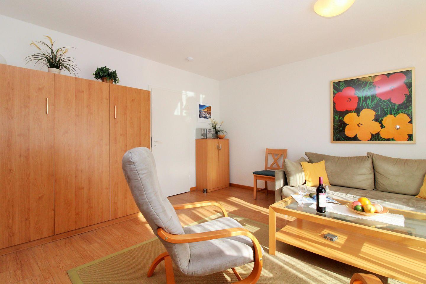 Das moderne und geräumige (kombinierte) Wohn-/Schlafzimmer verfügt über eine Sitzecke mit einer großen und bequemen (Schlaf-)Couch, 2 Sessel und Couchtisch sowie ein geräumiges Sideboard. Darüber hinaus befindet sich in diesem Zimmer ein bequemes ausklappbares Schrankbett (2 x 80 x 200 cm), welches guten Schlafkomfort für 2 Personen bietet. Eine zusätzliche bequeme Schlafmöglichkeit für eine weitere 3. bzw. 4. Person bietet die mit wenigen Handgriffen ausziehbare und komfortable Schlafcouch. Alternativ könnte eine Person ggfs. auch auf dem aufklappbaren (Schlaf-)Sessel im separaten Flur der Fewo schlafen. Ihre Urlaubsgarderobe können Sie im geräumigen Kleiderschrank im Flur unterbringen.