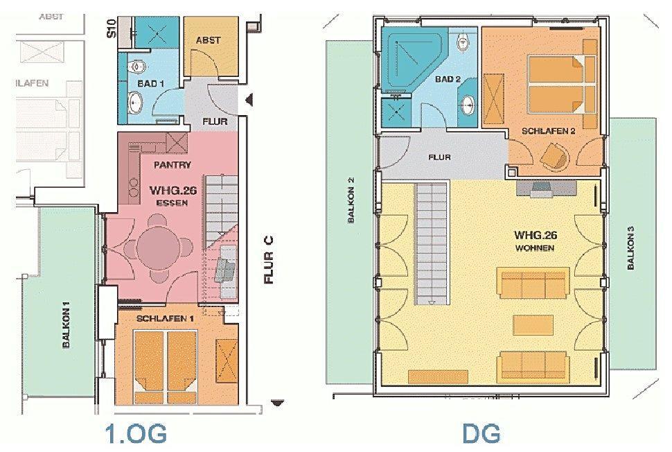 Zur Wohnung gehören insgesamt ein Balkon im 1. OG und zwei große Dachterrassen im 2. OG. Diese sind alle mit bequemen Sitz- und Liegemöbeln ausgestattet.