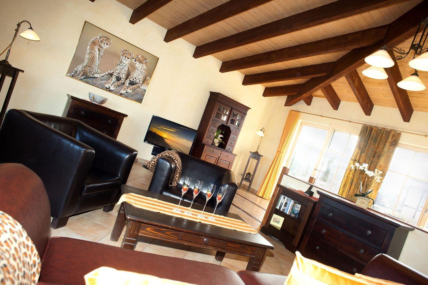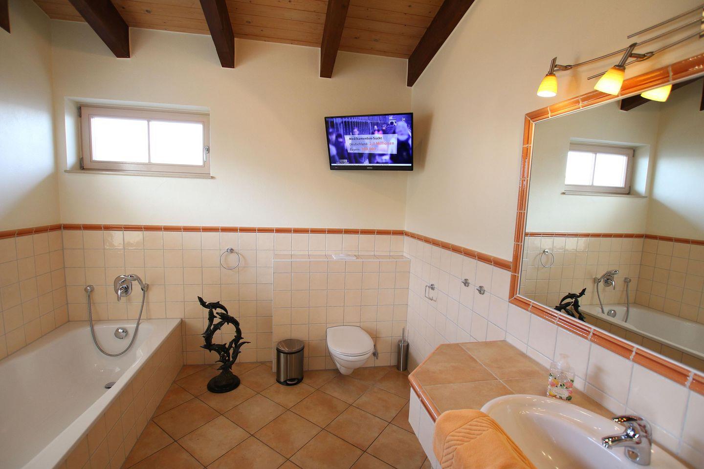 Zu Ihrer Unterhaltung verfügt die Ferienwohnung über 5 moderne Flatscreen-TV-Geräte (Kabel-TV) in allen Wohn- und Schlafräumen sowie dem Badezimmer im OG inklusive DVD-Player sowie eine HiFi-Anlage. Kostenfreies WLAN steht Ihnen ebenfalls zur Verfügung.