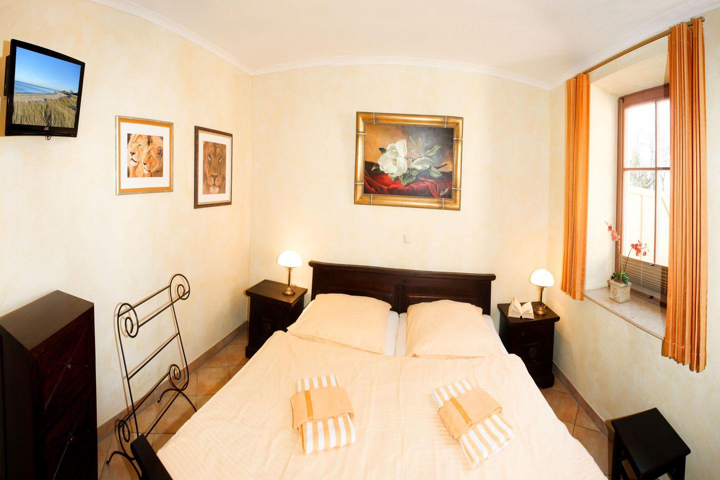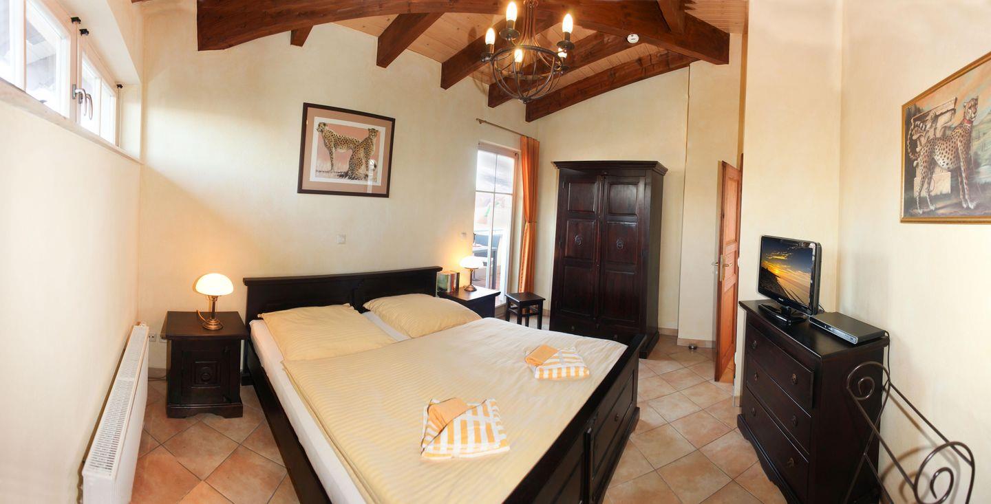 Die 2 gemütlichen und freundlichen Schlafzimmer (1 x im 1. OG sowie 1 x im 2. OG) sind jeweils mit bequemen Doppelbetten, Nachttischen sowie einem geräumigen Kleiderschrank eingerichtet. Das Schlafzimmer unten hat einen Zugang zum dortigen Balkon, das Schafzimmer oben hat einen separaten Zugang zur dortigen Dachterrasse.