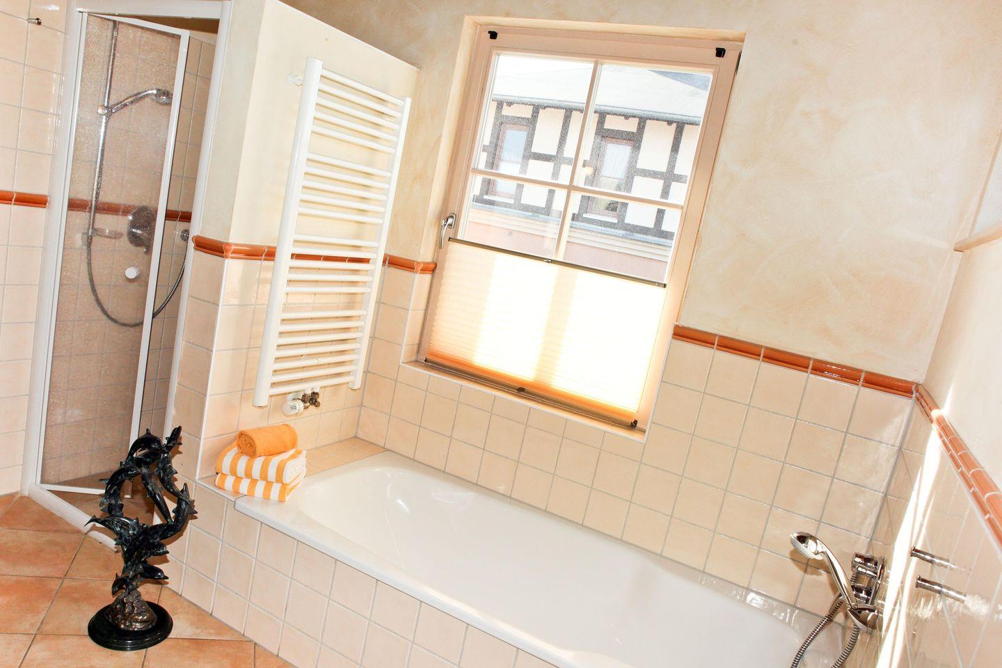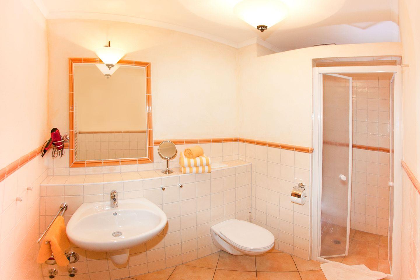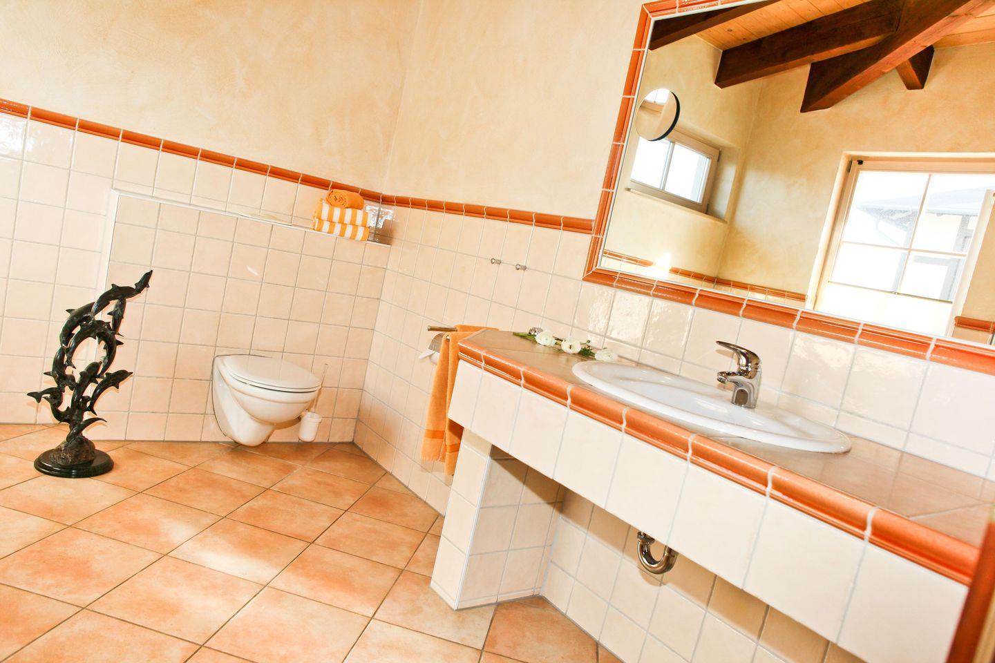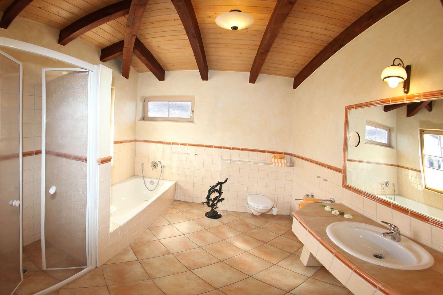 Die Wohnung verfügt über 2 helle und moderne Badezimmer (1 x im 1. OG sowie 1 x im 2. OG). Beide Badezimmer sind jeweils mit einer Dusche mit ebenerdigem Einstieg, WC sowie ausreichend Ablageflächen ausgestattet, das obere Badezimmer hat zusätzlich noch eine Badewanne.