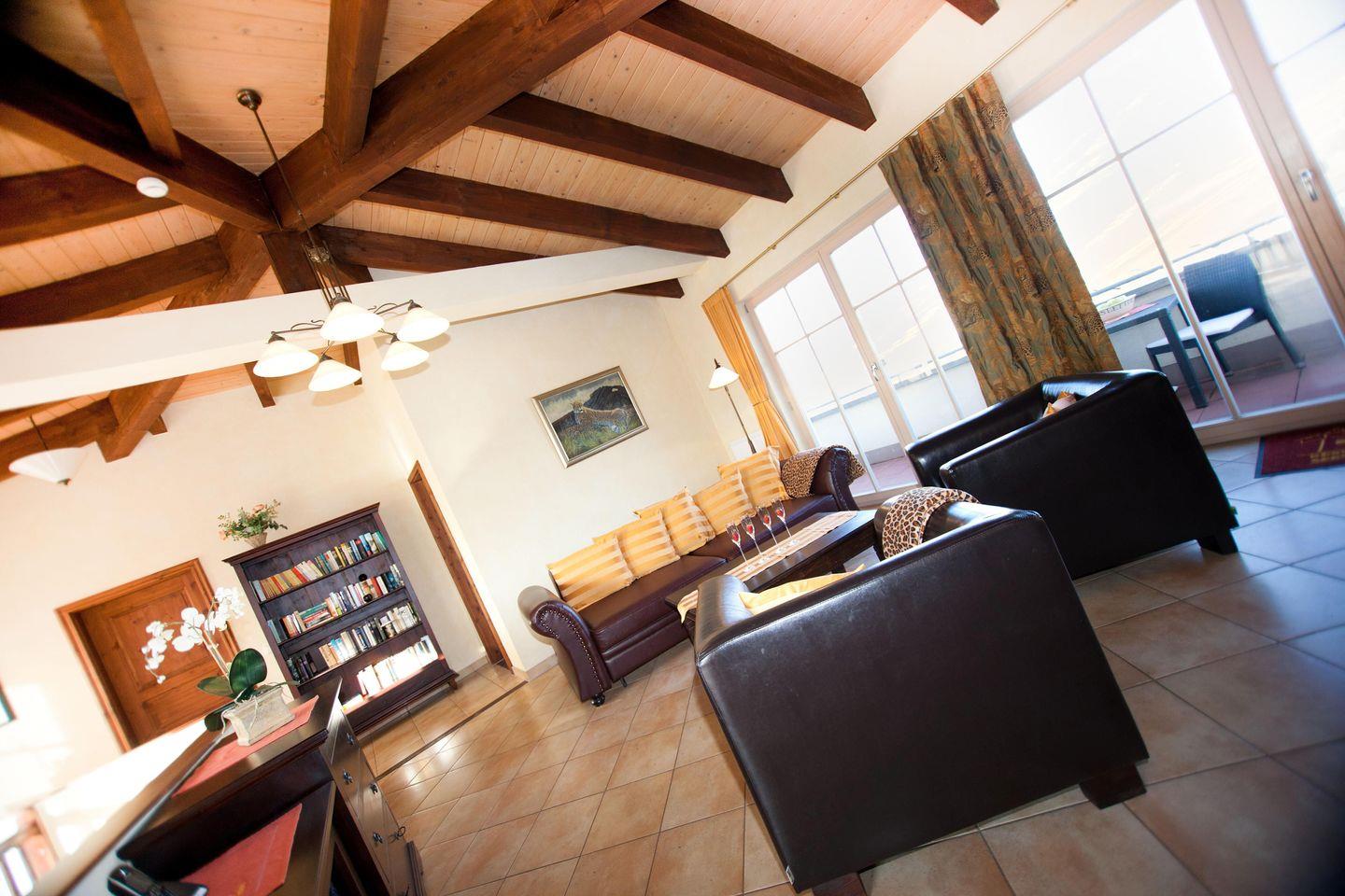 Das sehr geräumige und sehr geschmackvolle Wohnzimmer im 2. Obergeschoss ist mit einer separaten Sitzgruppe mit Couch, Couchtisch und 2 Sesseln sowie diversen Sideboards und Schränken eingerichtet. Von hier aus gelangen Sie auf die 2 schönen und großen Dachterrassen mit teilweisem Meerblick.