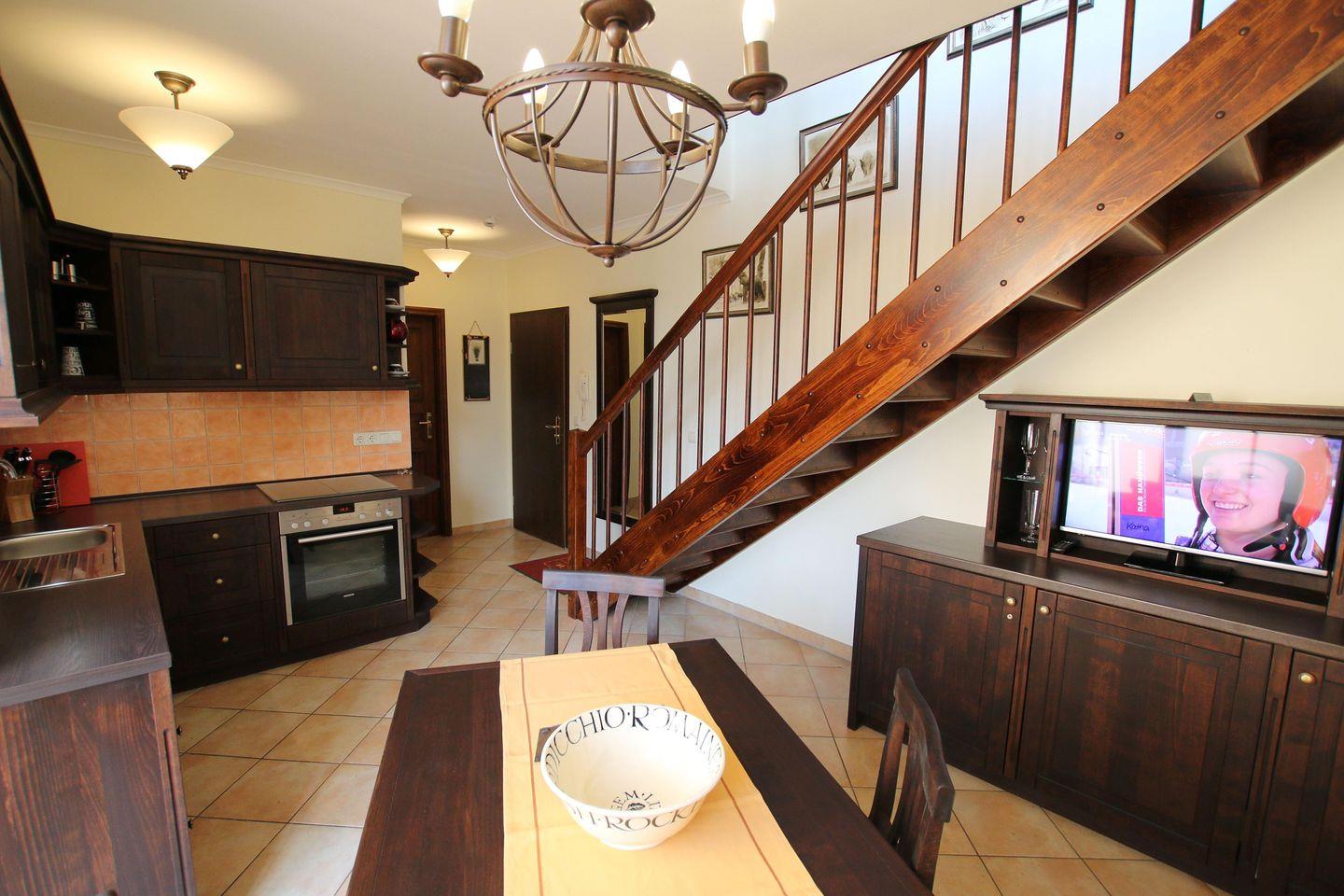Im unteren Bereich der Wohnung befindet sich die Wohnküche mit voll ausgestatteter Küchenzeile mit 4-Platten-Ceranfeld, Dunstabzug, Backofen, Kühlschrank mit Gefrierfach, Geschirrspülmaschine, Mikrowellengerät, Kaffeemaschine, Wasserkocher und Toaster sowie einem großen Esstisch mit Stühlen. Die Küche ist mit Geschirr, Gläsern, Besteck und Töpfen vollständig und bestens ausgestattet.