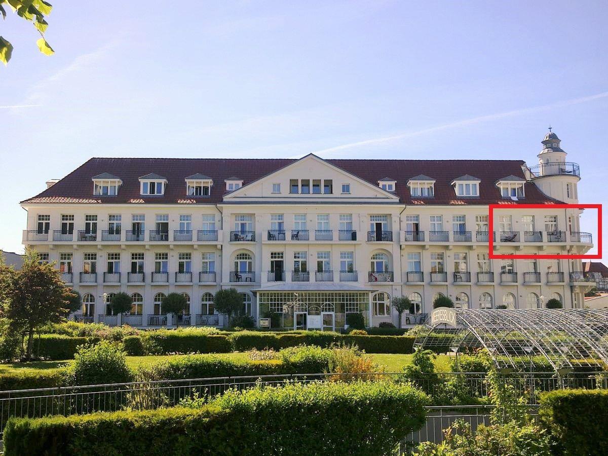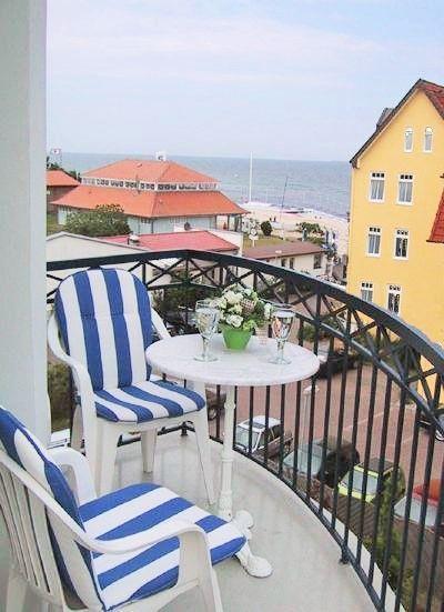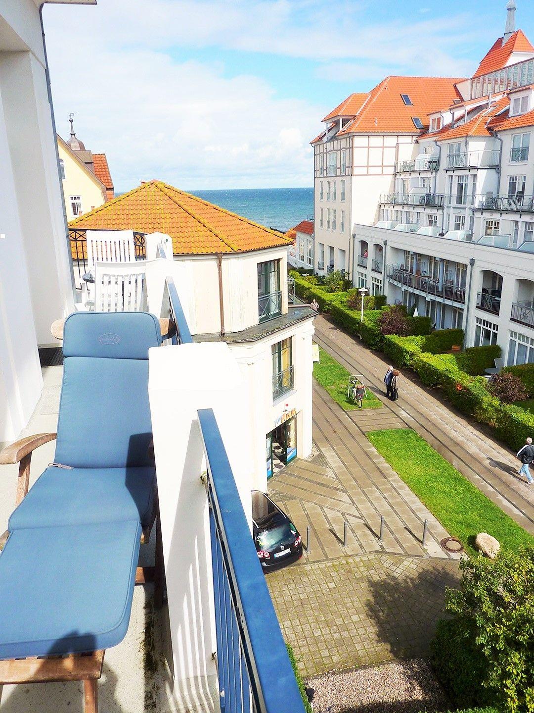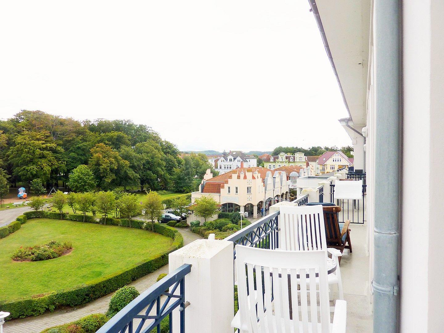 Das helle und freundliche Wohn-/Esszimmer verfügt über eine separate Sitzgruppe mit bequemer Couch, 2 Sesseln und Couchtisch sowie einen separaten Esstisch mit 4 Stühlen. Vom Wohnzimmer aus haben Sie 2 direkte Zugänge zu dem ca. 10 m² großen und sonnigen Balkon (nach Osten, Süd-Osten, Westen und Norden ausgerichtet) mit verschiedenen Balkonmöbeln und Sonnenliegen – von hier aus genießen Sie einen traumhaft schönen Blick auf die nahe Ostsee, in den unmittelbar benachbarten wunderschönen Baltic-Park sowie über die Dächer von Kühlungsborn!