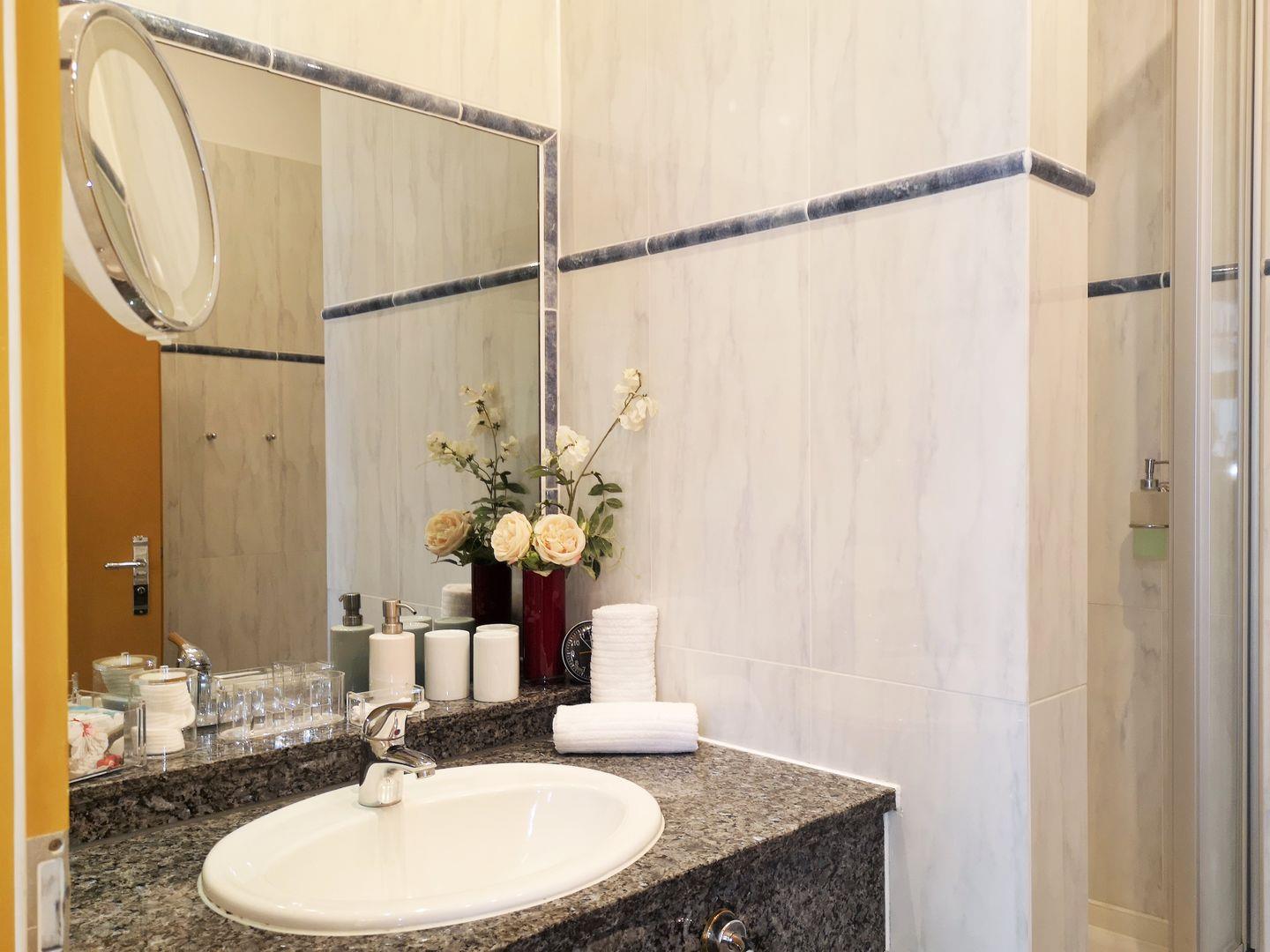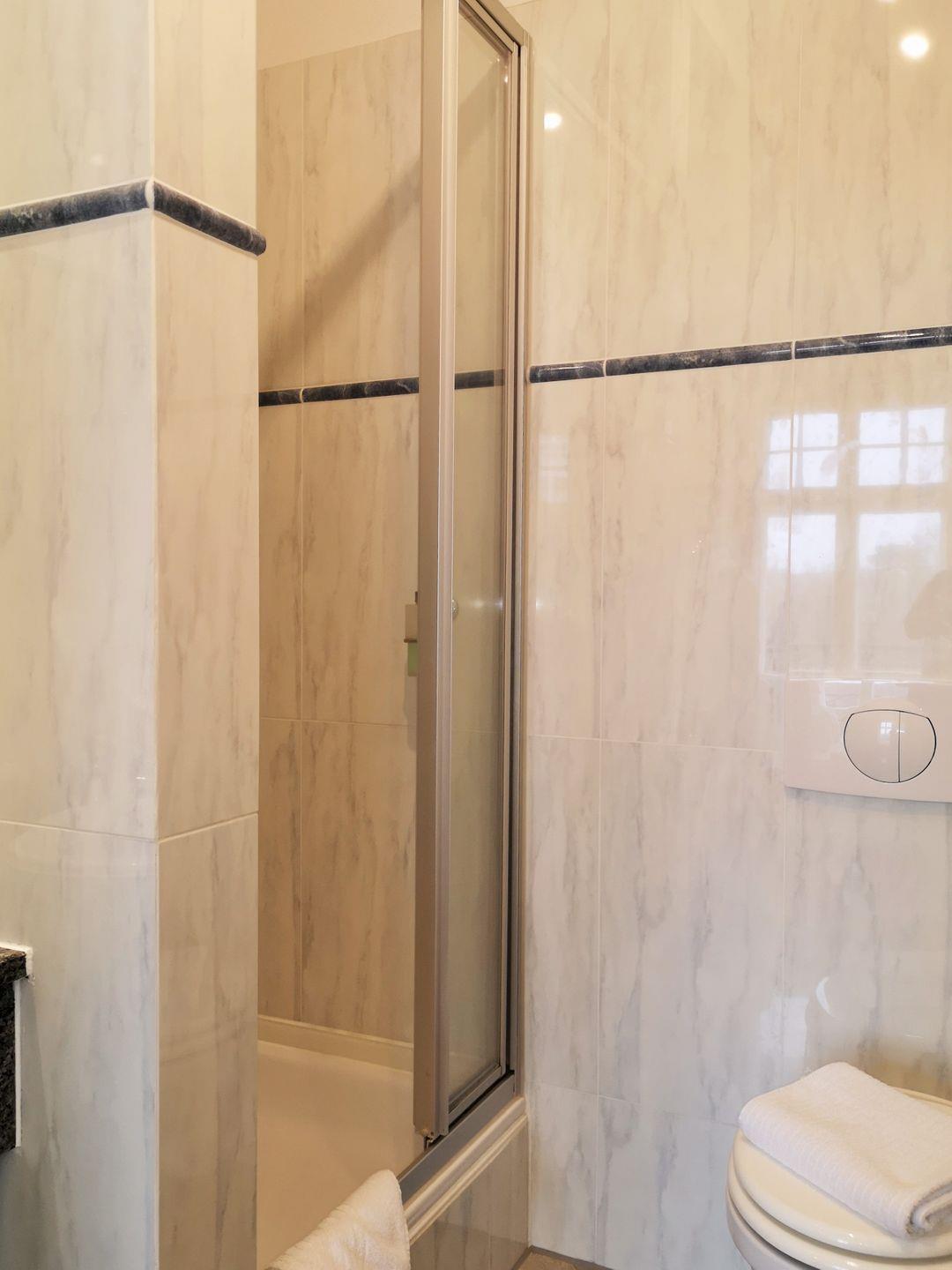 Das schöne und raumhoch mit hochwertigen Wandfliesen ausgestattete Badezimmer verfügt über eine Dusche, Waschbecken und WC sowie ausreichend Ablagemöglichkeiten.