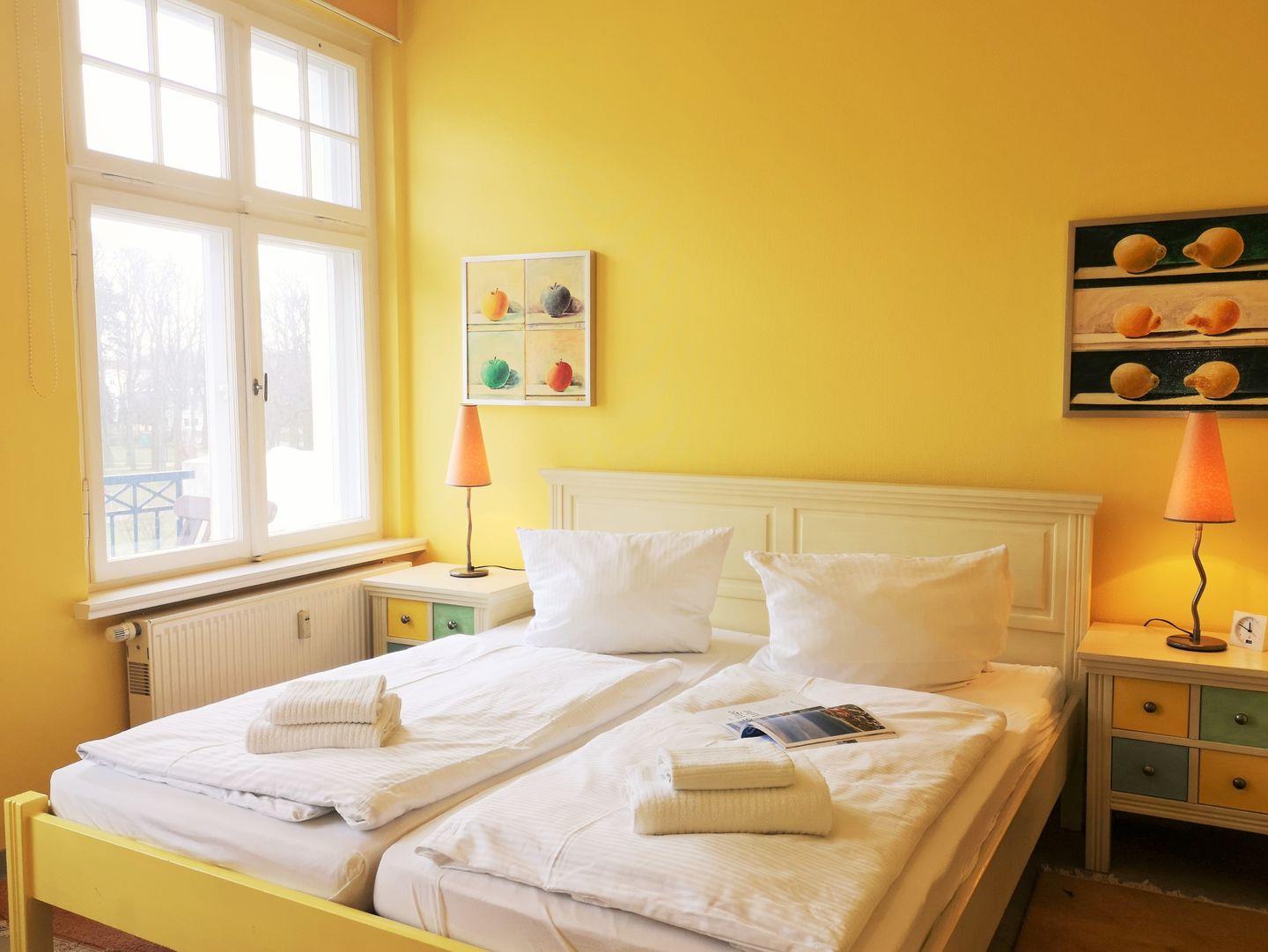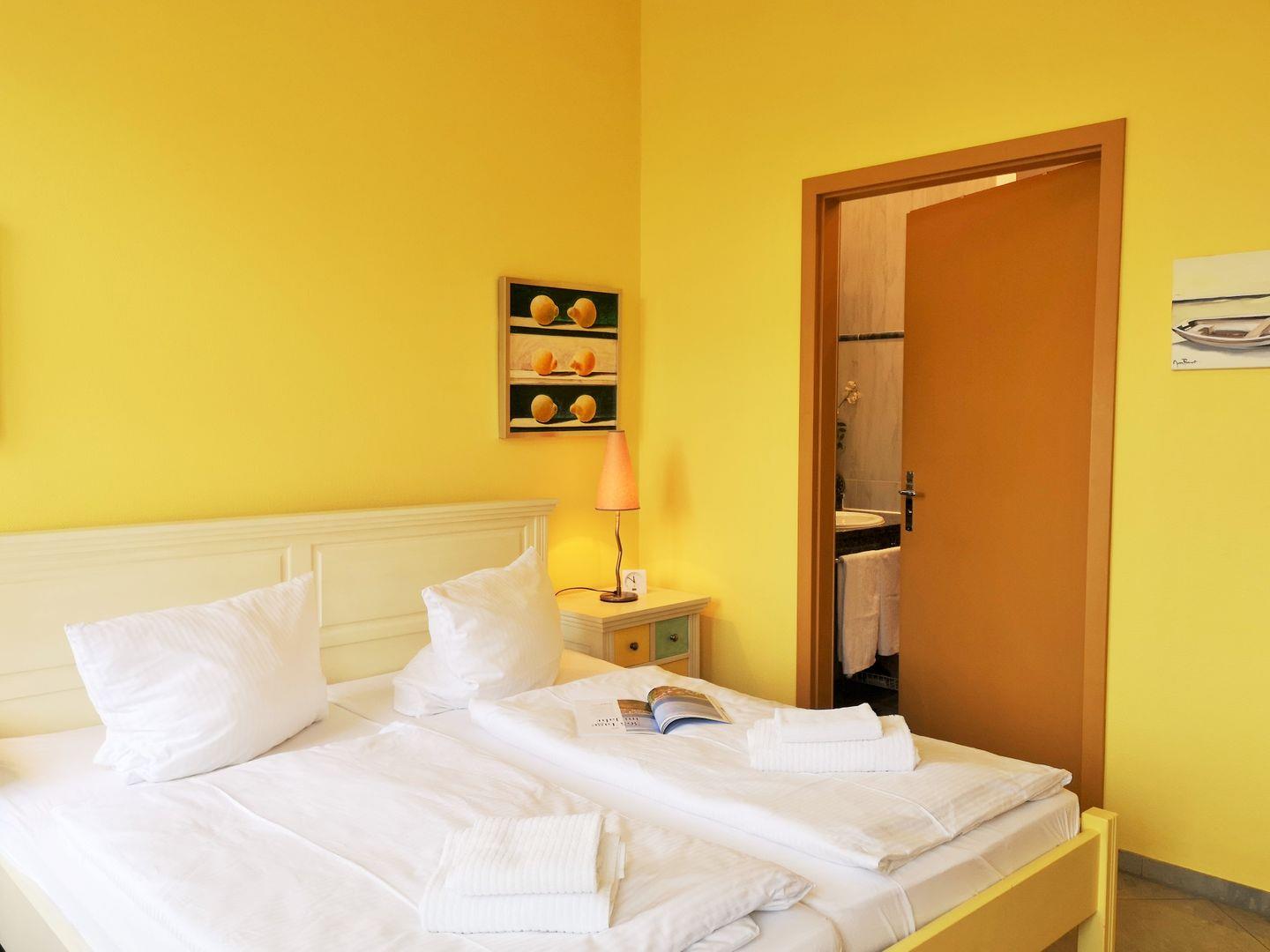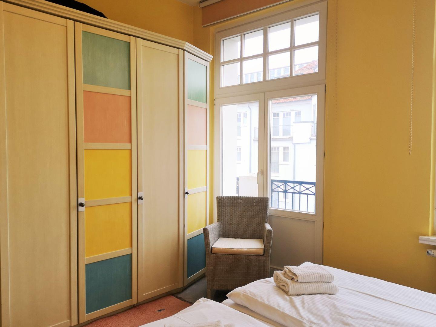 Das freundliche und moderne Schlafzimmer ist mit einem bequemen Doppelbett, Nachttischen sowie einem geräumigen Kleiderschrank eingerichtet und hat ebenfalls einen direkten Zugang zum Balkon. Eine zusätzliche bequeme Schlafmöglichkeit für eine weitere 3. bzw. 4. Person bietet die ausziehbare Schlafcouch im Wohnzimmer.